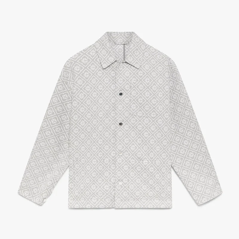 La chaqueta de trabajo gris con monograma es un diseño de manga larga, holgado, desenfadado y refinado, con el patrón de monograma de la casa en toda la prenda. Se completa con cuello, cierre de botones, un bolsillo en el pecho, bolsillos de parche delanteros y herrajes plateados.