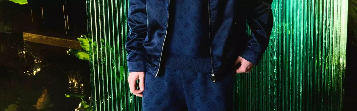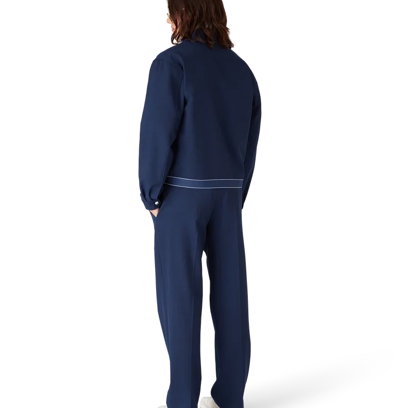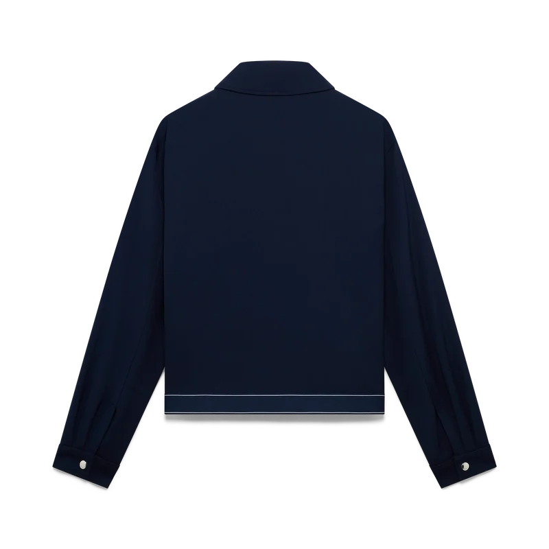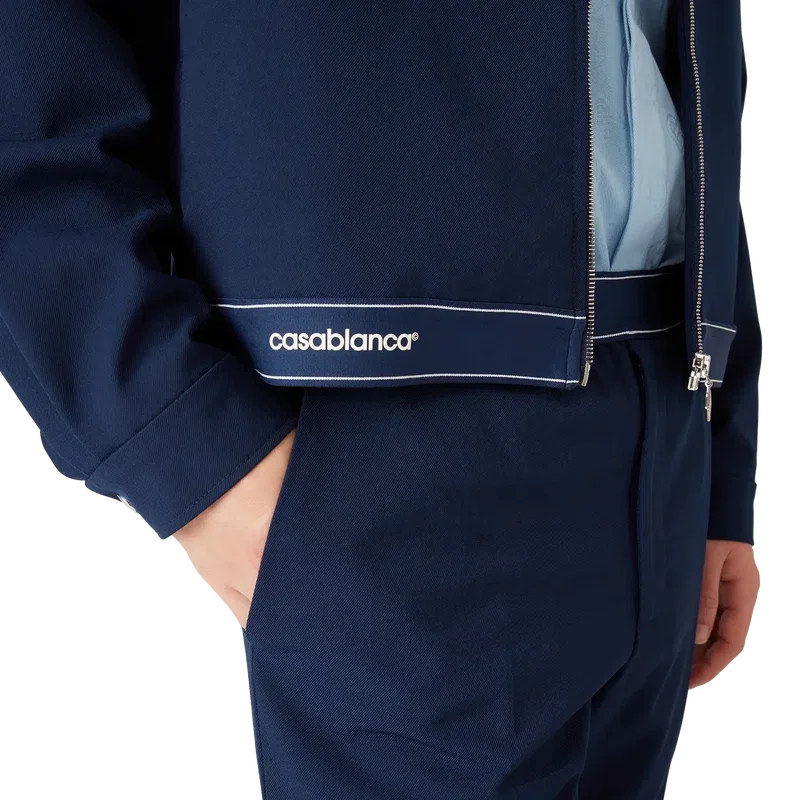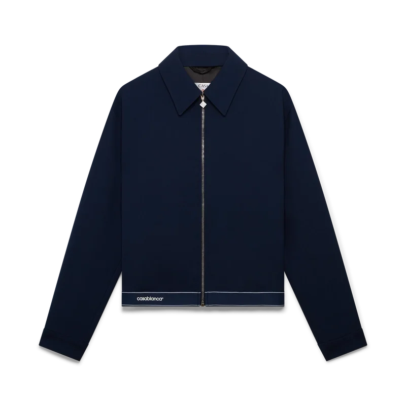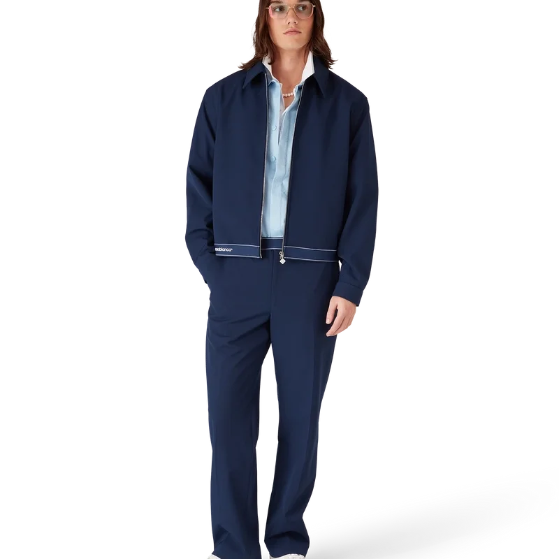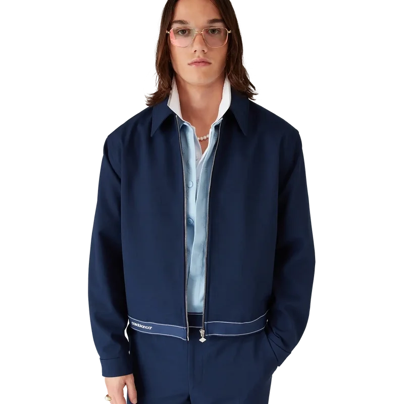 La chaqueta deportiva de lana azul marino es un diseño refinado confeccionado con un tejido de mezcla de lana, que refleja la sensibilidad deportiva y de ocio de la casa. Se completa con cuello en punta, cierre frontal con cremallera con la lengüeta con el logotipo de diamante característico, forro, herrajes dorados con la marca y detalle de cinta en el dobladillo con el logotipo de la casa Casablanca y borde rayado.
