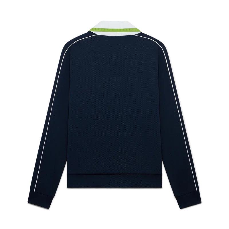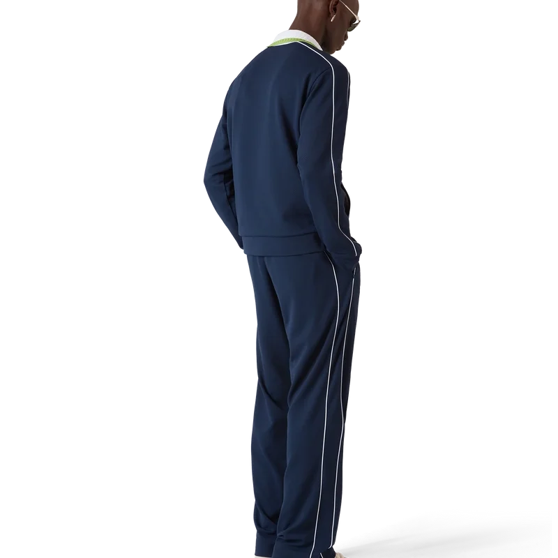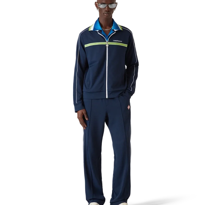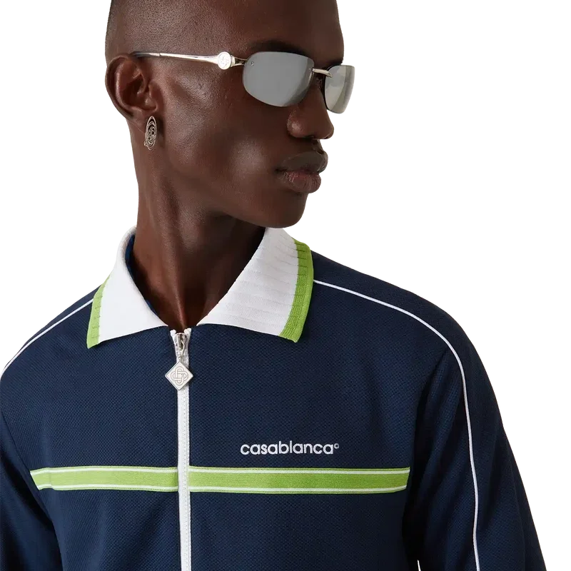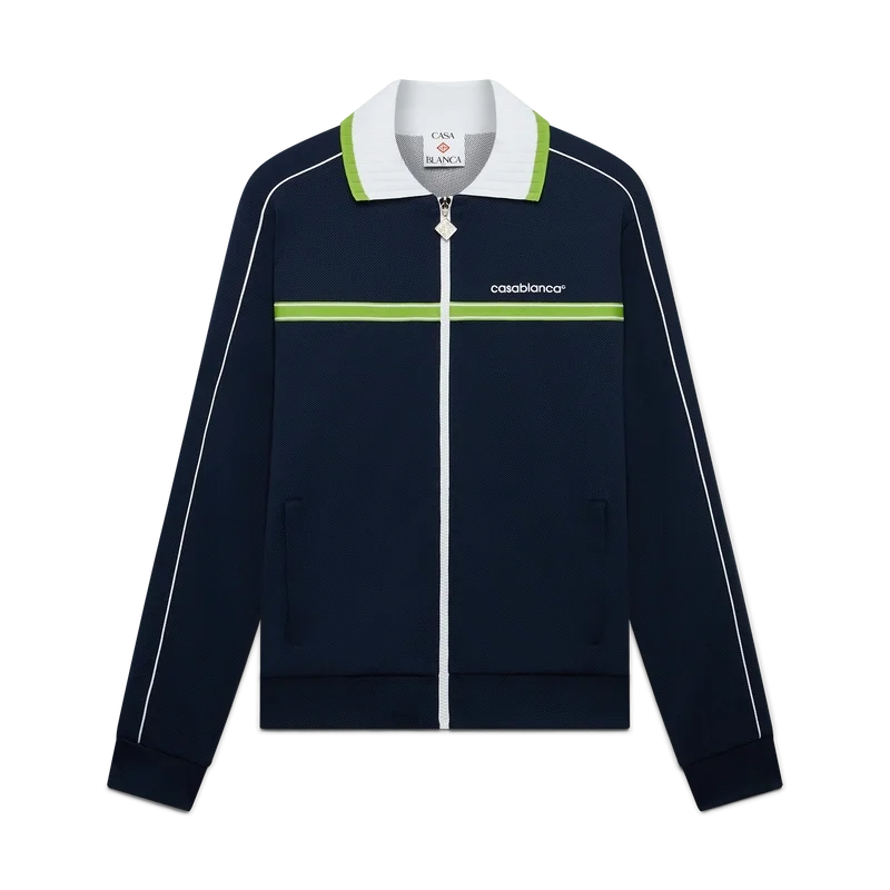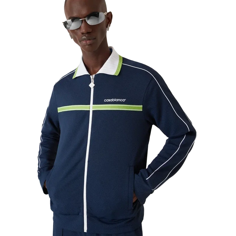 La chaqueta deportiva de piqué es un diseño clásico de ropa deportiva de manga larga que luce el logotipo Casablanca de la casa. Se completa con cierre de cremallera con el logotipo del diamante característico de la casa en la lengüeta, cuello acanalado, detalle de rayas verdes y blancas en el pecho, ribetes en los hombros y a lo largo de las mangas, forro y dobladillos y puños acanalados.