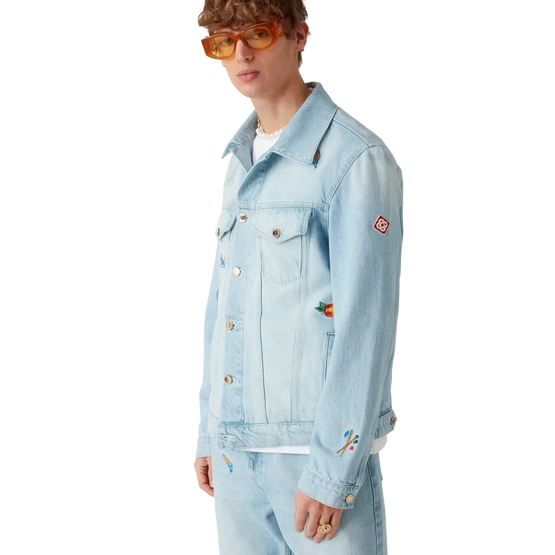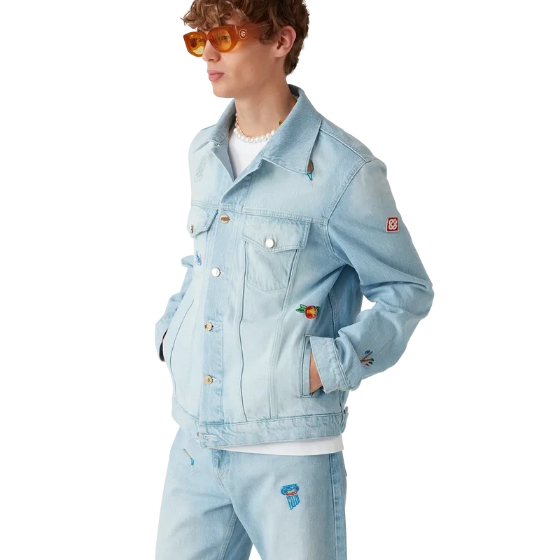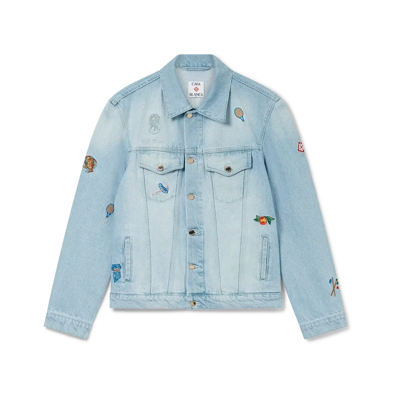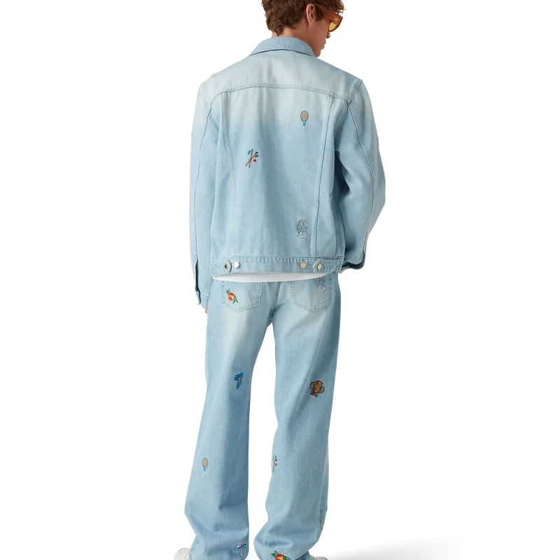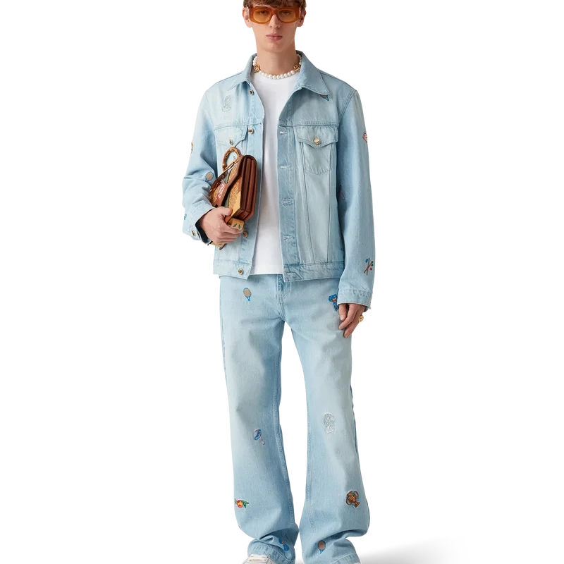 La chaqueta de mezclilla con motivos bordados presenta una silueta clásica confeccionada en tela de algodón bordada y diseñada para un ajuste clásico. Acabada con motivos bordados que representan la simbología de la casa con la naturaleza y la arquitectura, bolsillos en el pecho y cierre con botones a presión chapados en oro. Diseñada para llevarse con sus jeans de pierna recta a juego.
