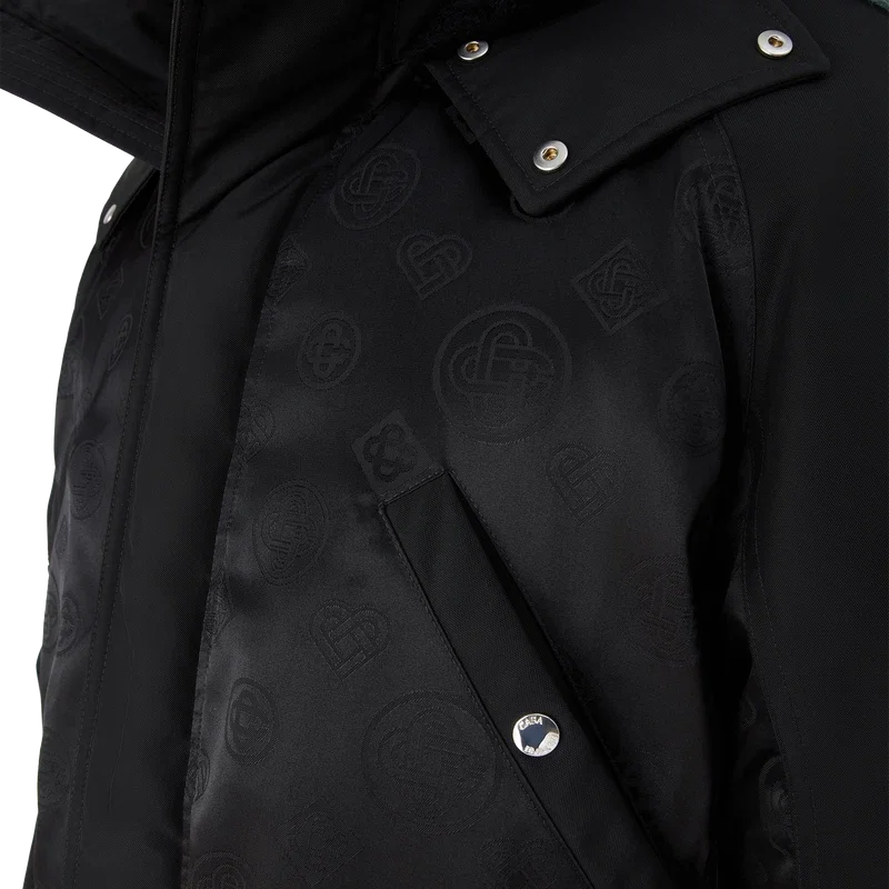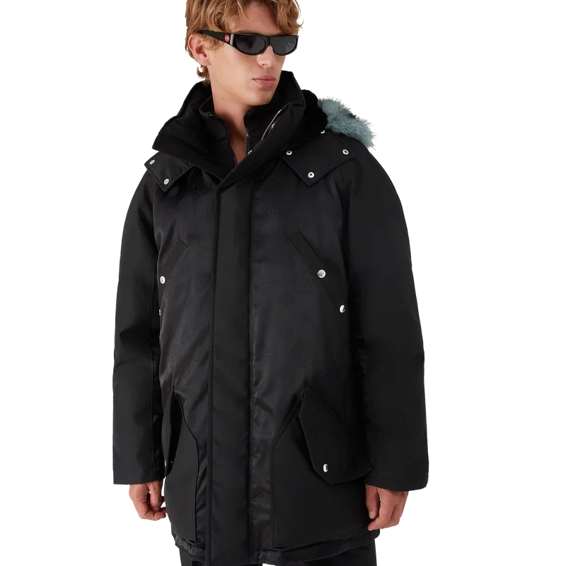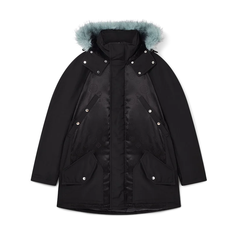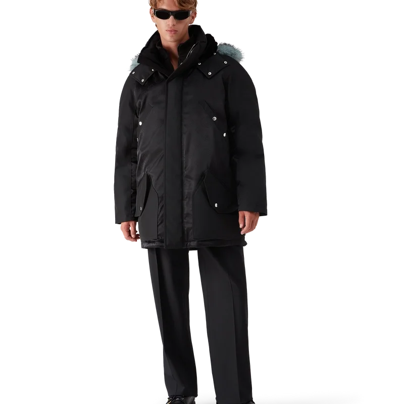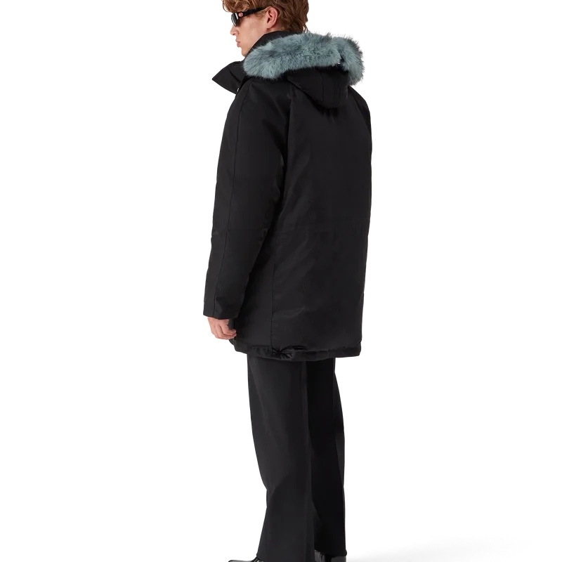 La parka de nylon es una prenda de ropa de abrigo confeccionada en tejido de nylon con el monograma y el estampado Honeydew de la casa en un tejido técnico negro sobre negro. Se completa con una capucha desmontable con ribete de piel sintética, cierre con cordón, cierre de cremallera, bolsillos en el pecho y bolsillos de parche con herrajes de la marca, y puños internos de punto elástico.