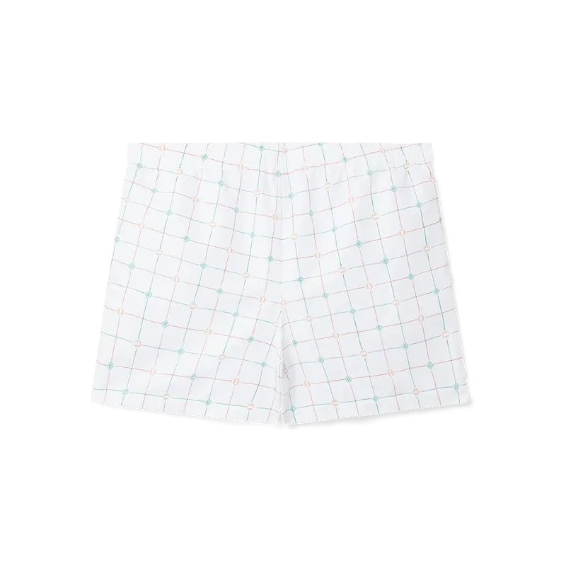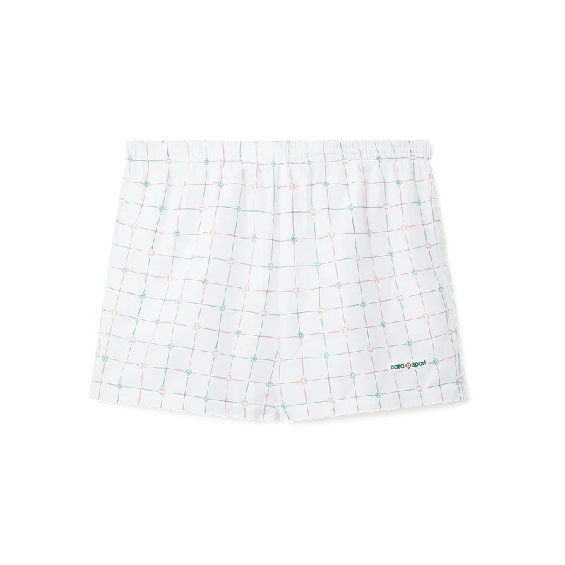 Los pantalones cortos de baño con estampado de cuadros de tenis están confeccionados en tejido técnico de poliéster con un diseño de cuadros naranjas y verdes de Casablanca Paris. Cuentan con cintura elástica, cierre con cordón y bolsillos laterales.