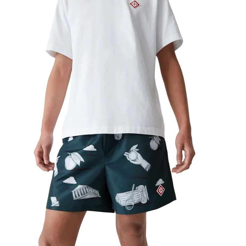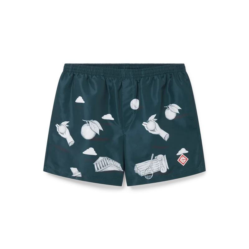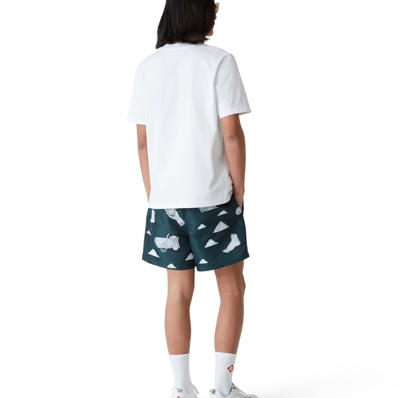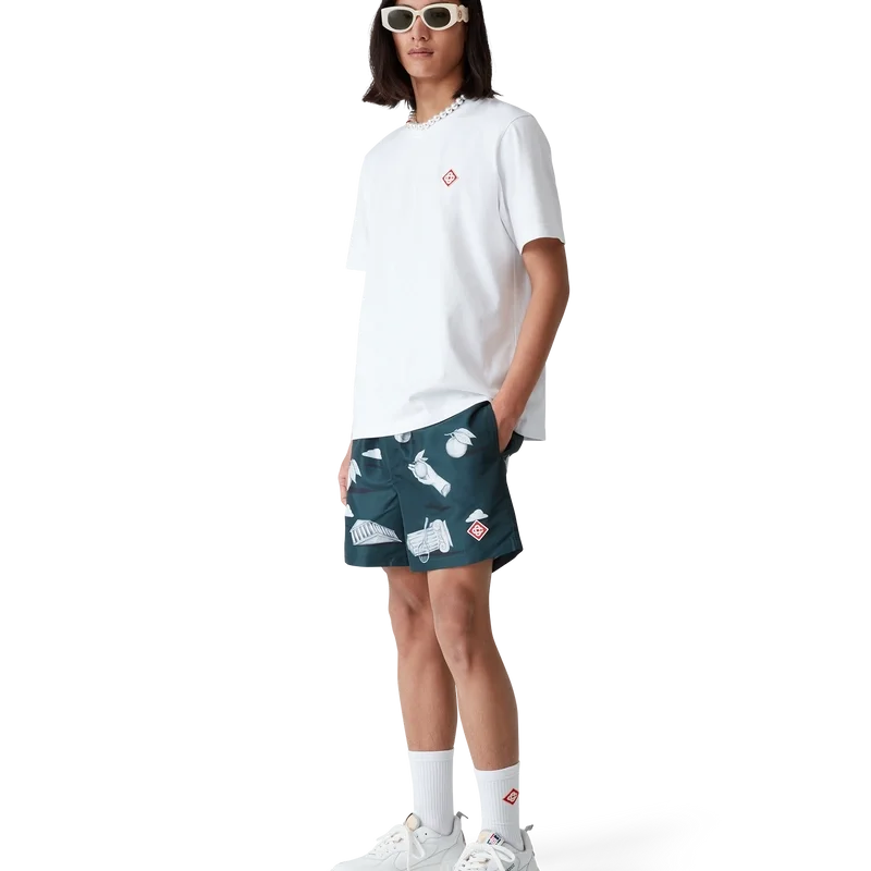 Los pantalones cortos de baño Metaphysical son un diseño clásico confeccionado con un tejido técnico de poliéster que presenta el logotipo del diamante característico de la casa y un diseño repetitivo en trampantojo con efecto de piedra y un ligero dibujo de los elementos de diseño principales. Se completan con una cintura elástica, un cordón interno, bolsillos laterales en las costuras, un forro y un bolsillo interno.