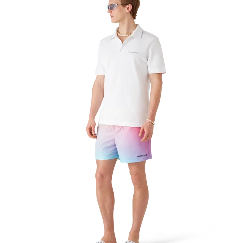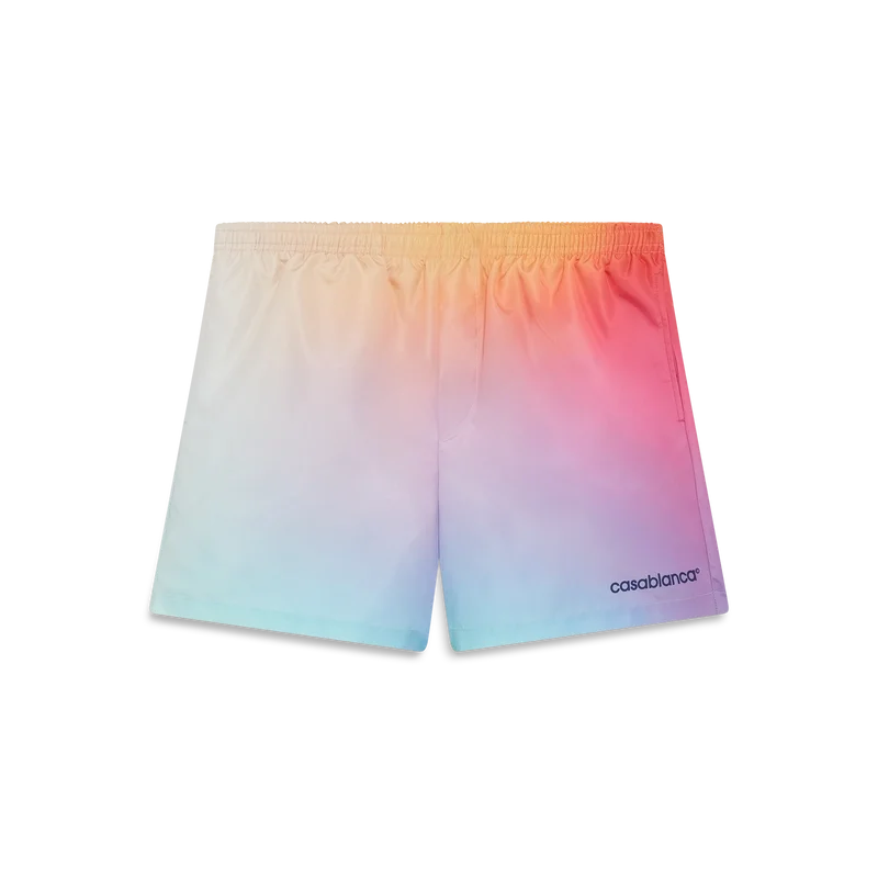 Los pantalones cortos de baño con estampado degradado presentan un diseño refinado con la combinación de colores degradados de la temporada. Cuentan con una cintura elástica, cierre con cordón interno, bolsillos laterales en las costuras, forro, detalle de rayas en el dobladillo y el logotipo de la marca.