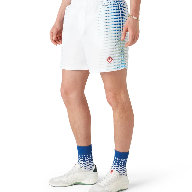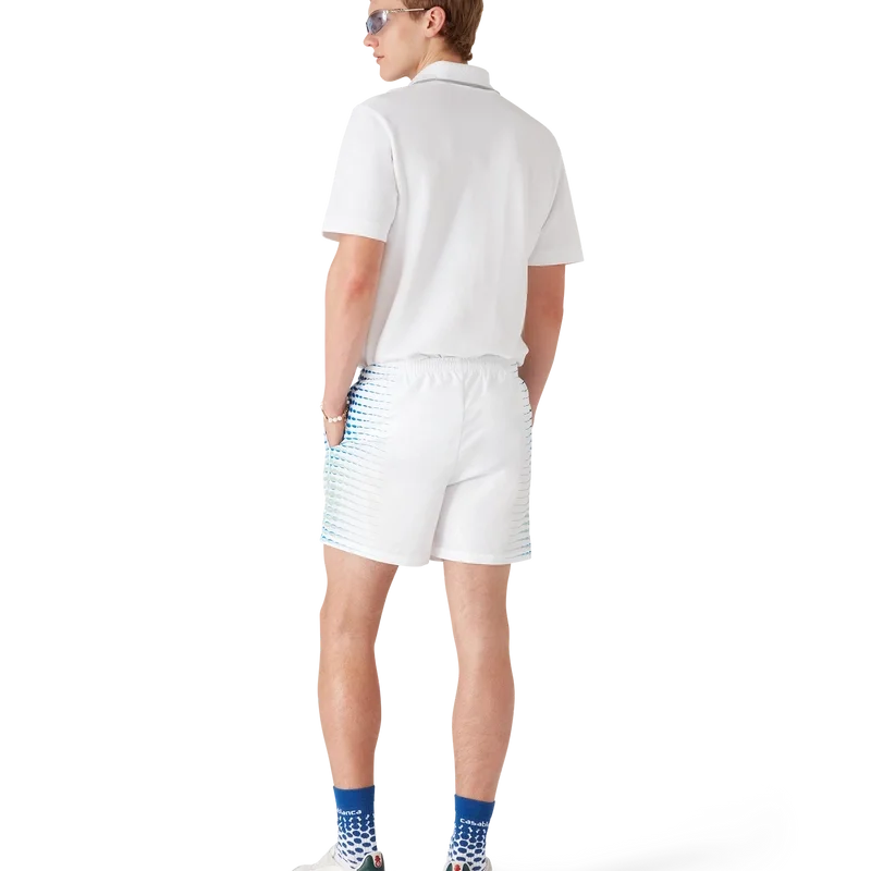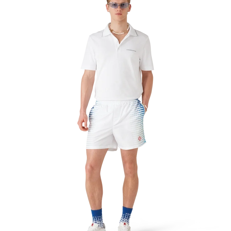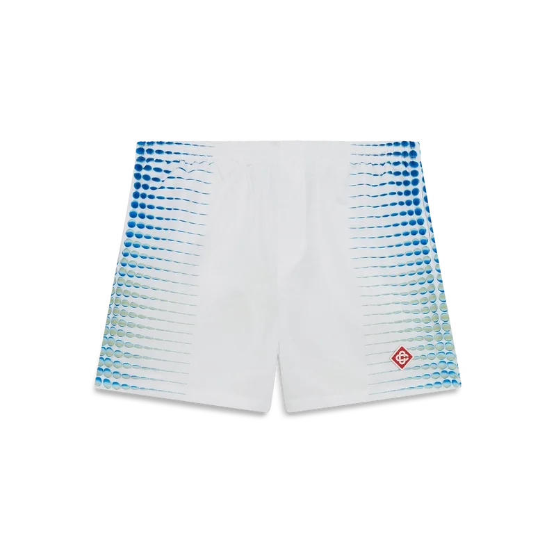 Los pantalones cortos de baño estampados presentan un diseño refinado con ilustraciones creadas en colaboración con Martin Naumann, conocido por su trabajo con degradados y efectos de textura, creando semitonos y efectos similares al vidrio. Cuentan con una cintura elástica, cierre con cordón interno, bolsillos laterales en las costuras y forro.
