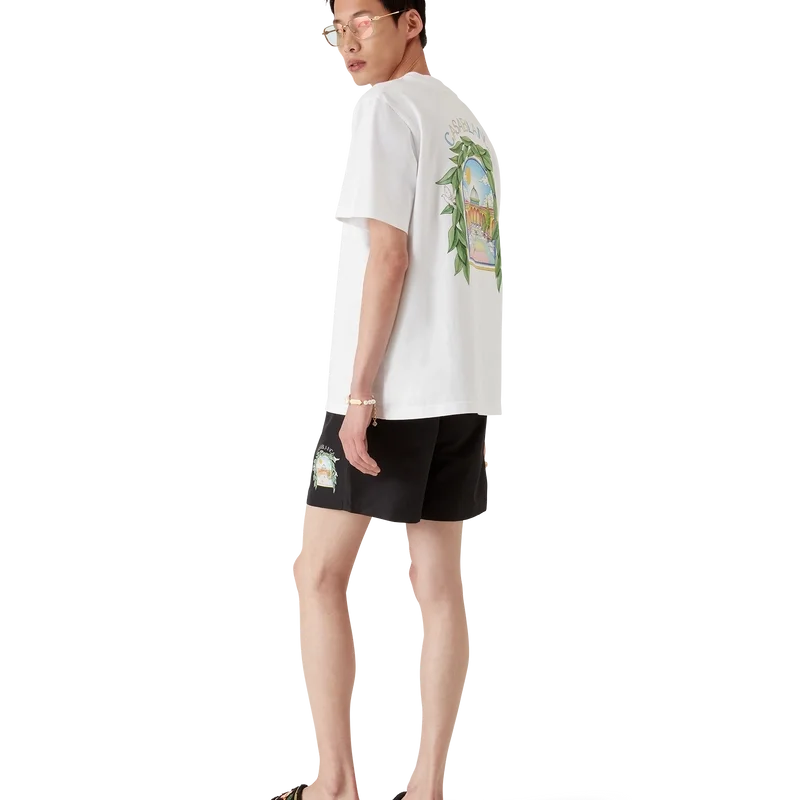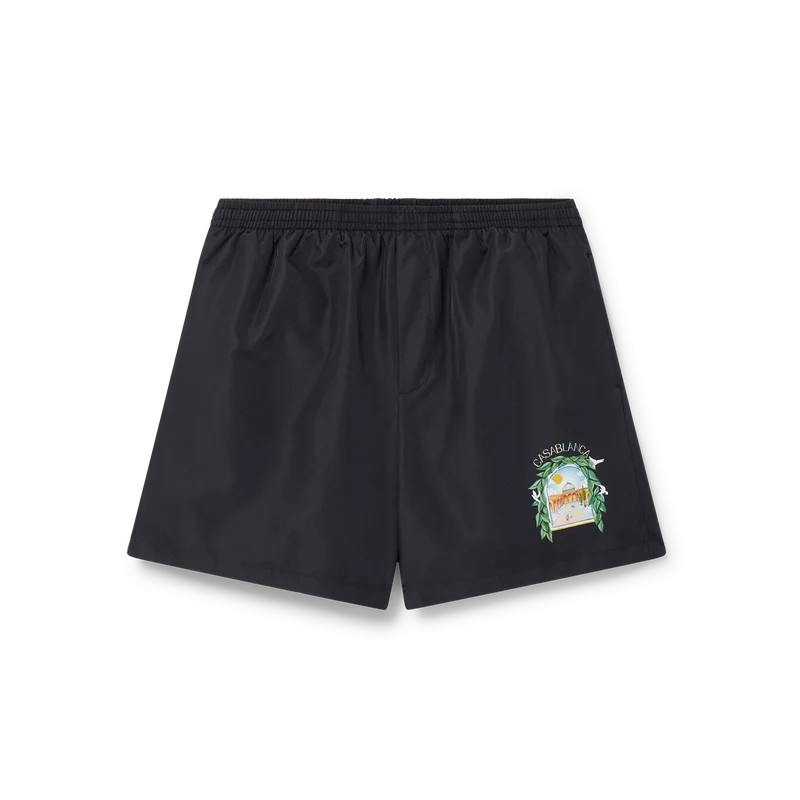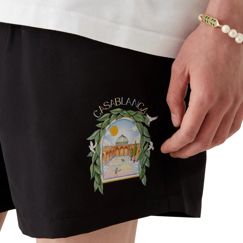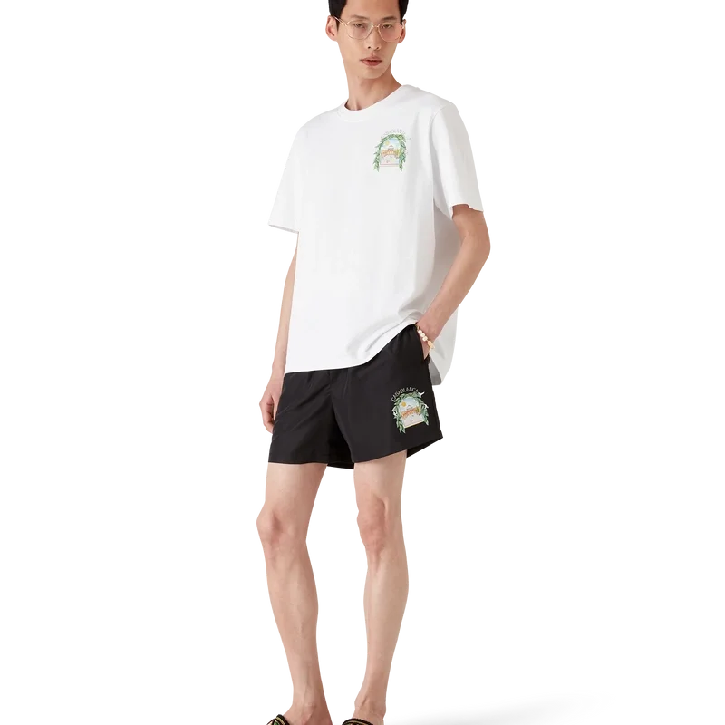 Los pantalones cortos de baño L’arche De Tennis están confeccionados en un tejido de poliéster con el estampado del arco característico de la casa, reinterpretado esta temporada. Cuentan con una cintura elástica, cordón de ajuste con puntas doradas, bolsillos laterales en las costuras y un bolsillo trasero de parche.
