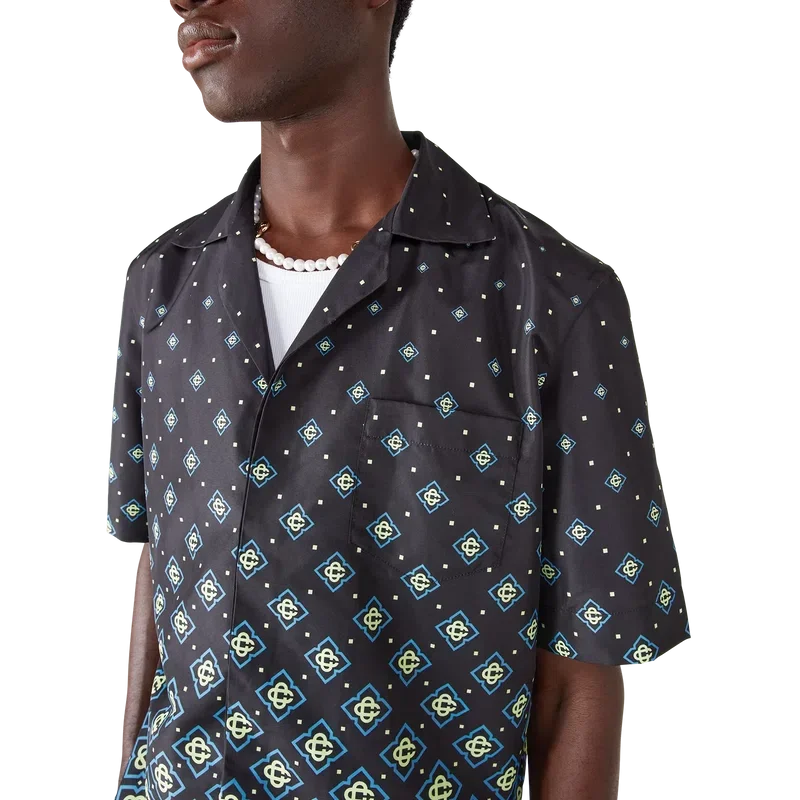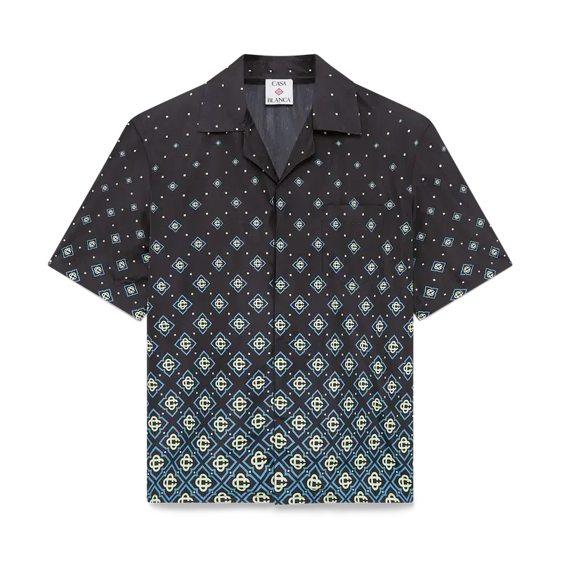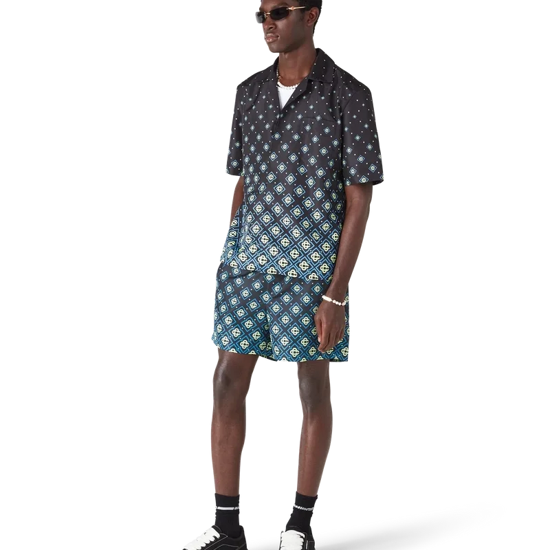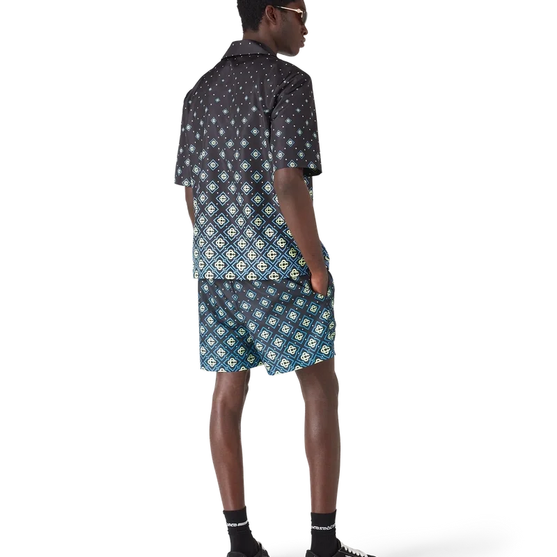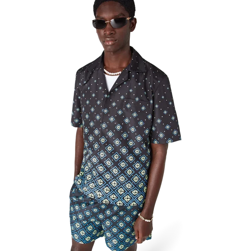 La camiseta de baño con monograma negro degradado es un diseño técnico refinado que presenta el patrón de monograma de la casa. Se completa con una confección en tejido técnico de baño, mangas cortas, cierre con botones, botones de corozo con el logotipo CC entrelazado y detalles sofisticados que capturan el enfoque sofisticado de la marca en cuanto a la ropa de baño.