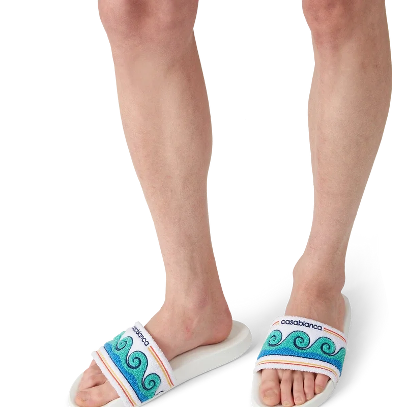 Las sandalias Greco-Wave Terry están confeccionadas con tejido de rizo bordado y presentan el diseño de temporada de la Maison en la parte superior. Se completan con suelas acolchadas de imitación de goma.
