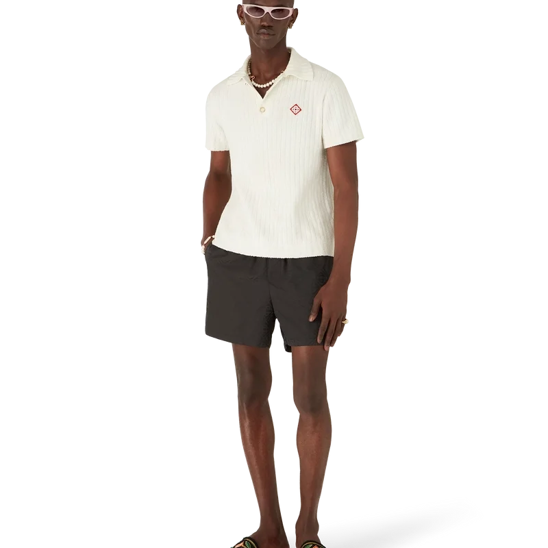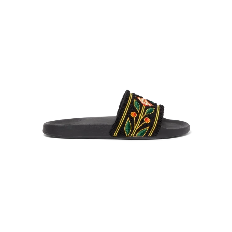 Las sandalias Laurel Terry están confeccionadas con tejido de rizo bordado y presentan el logotipo del diamante de la casa y el diseño característico de la corona de laurel en la parte superior. Se completan con suelas acolchadas de goma.