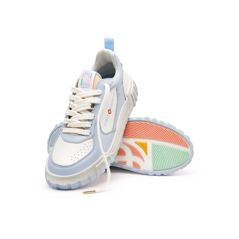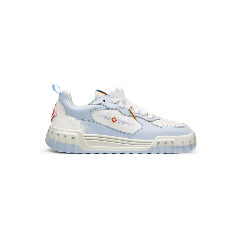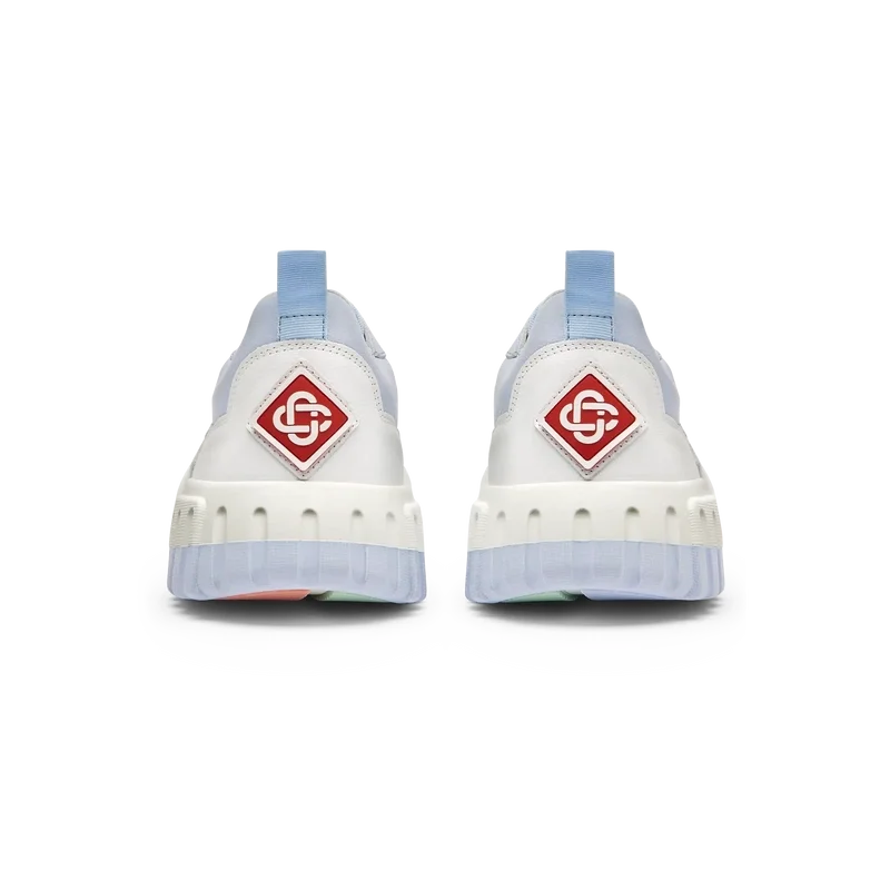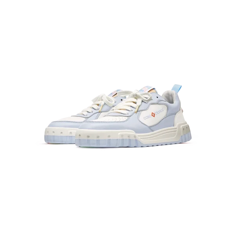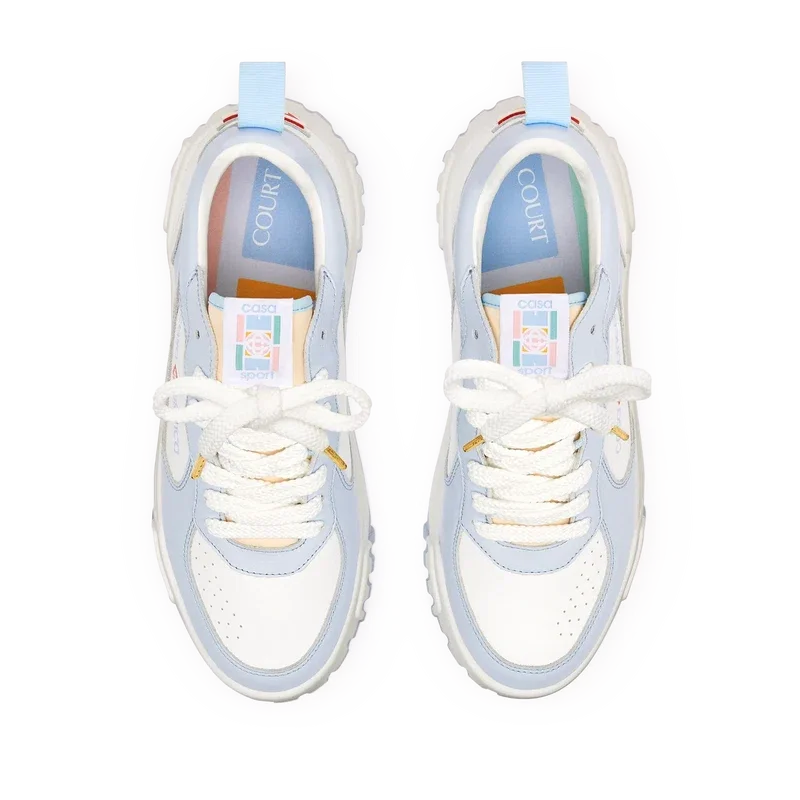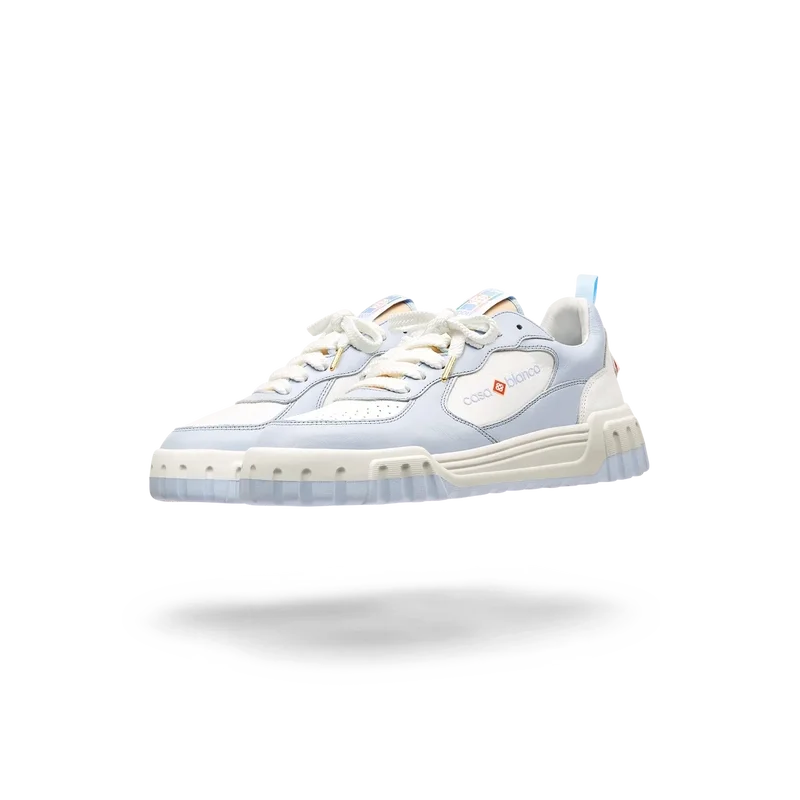 La parte superior de los zapatos presenta líneas de paneles integradas y fluidas como un guiño a las siluetas icónicas de los años 90. La prominente marca Casablanca es evidente en todo el calzado, incluyendo el motivo de diamante característico de la marca en el talón, el logotipo de silicona en los paneles laterales y la etiqueta de la lengüeta y la plantilla con el motivo de la cancha de tenis tejido, lo que da origen a su nombre, Court.