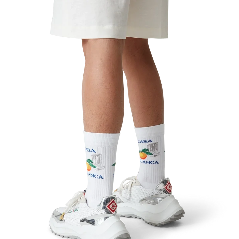 Revestimientos de charol cromado a tono, parte superior de cuero perforado, cordones de gamuza en contraste, parche de goma con el diamante de Casablanca en la lengüeta del talón, lengüeta lateral tejida con la marca Casa Sport, etiqueta Atlantis tejida en la lengüeta, entresuela de EVA esculpida en forma de onda, suela de goma, puntas de cordones doradas