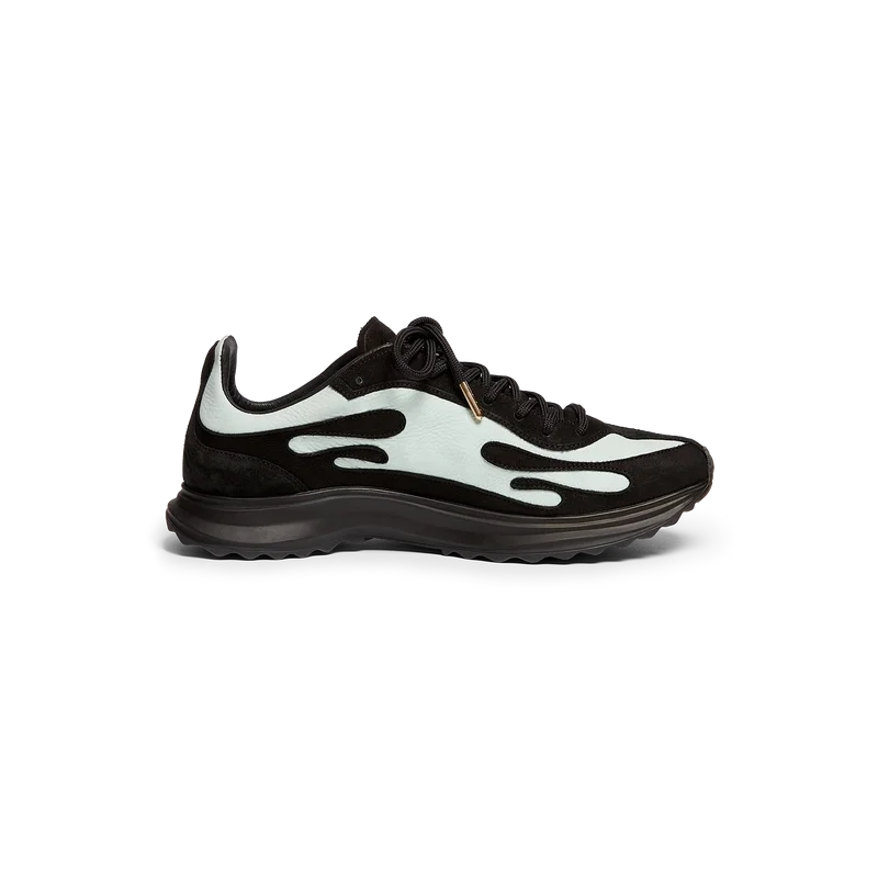 Las zapatillas Stade para mujer en negro y menta toman su nombre de la antigua medida griega para la distancia de una carrera a pie, que más tarde se convirtió en la palabra «estadio». El estilo se inspira en los zapatos de running de alto rendimiento y es una transferencia de la tecnología moderna a la tradición antigua. La parte superior de los zapatos está confeccionada en piel y la suela es de goma.
