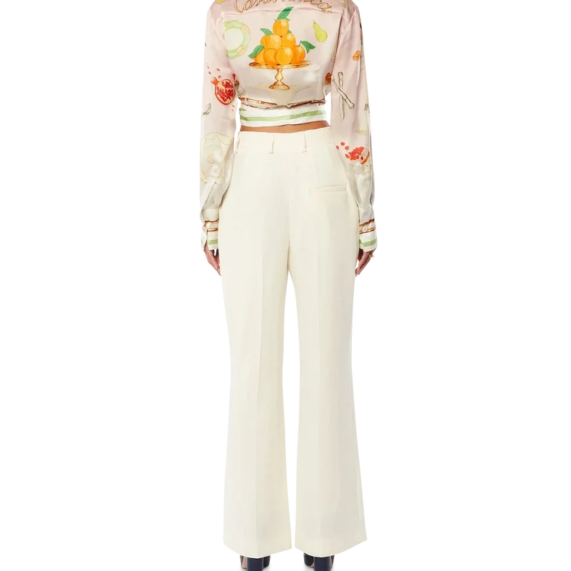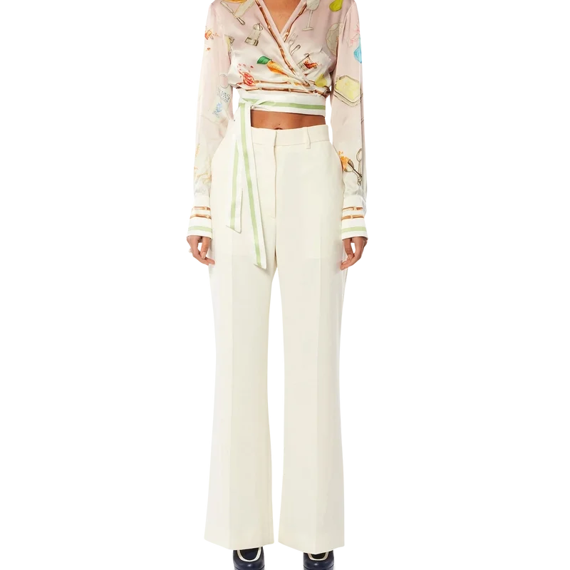 La blusa cruzada Ne Pas Deranger es un diseño de manga larga y cuello en V con un estampado integral que presenta la clásica pirámide naranja iconográfica de la casa. Confeccionada en tejido de sarga de seda, esta prenda se completa con un cierre cruzado con lazo, detalles de rayas en el cuello, los puños, el dobladillo y el lazo, y una etiqueta con la marca Casablanca.