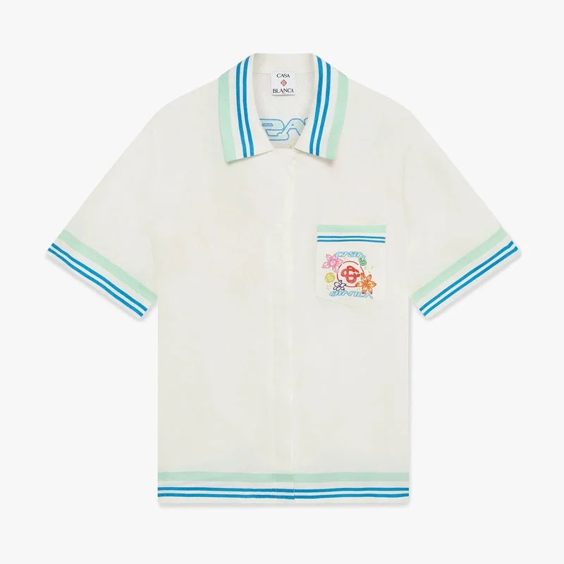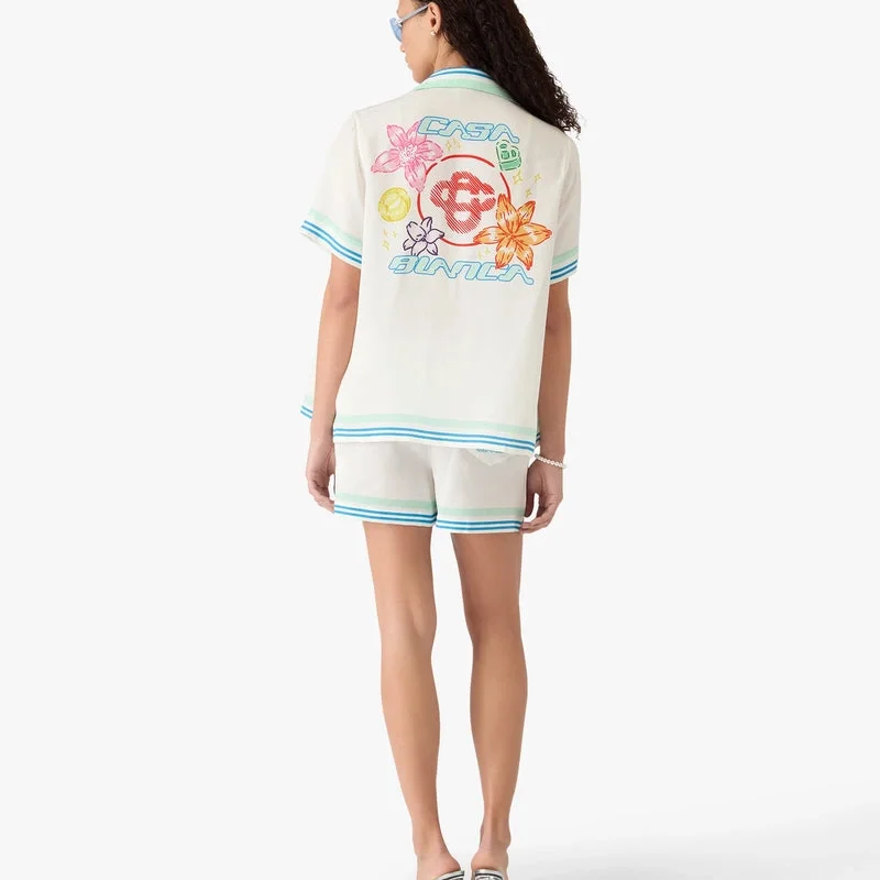 La camisa de seda de pantalón corto con cuello cubano y estampado floral es un diseño impreso que presenta el collage gráfico de la temporada con interpretaciones del logotipo, una cara sonriente y una flor de orquídea. Se completa con cuello cubano, cierre de botones, botones de corozo con el logotipo Cc entrelazado, un bolsillo en el pecho y detalles de rayas verdes, azules y blancas en el cuello, los puños, el dobladillo y el bolsillo, en una silueta holgada.