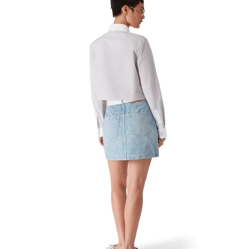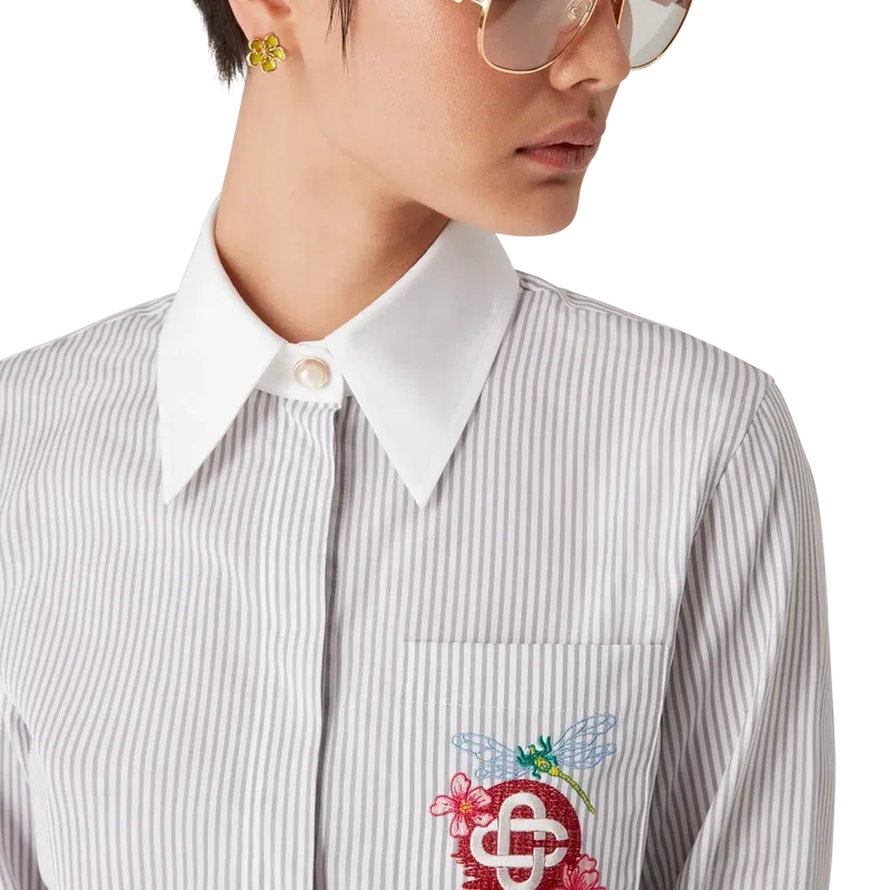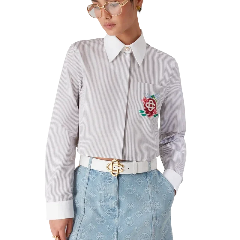 La camisa corta de manga larga a rayas es un modelo corto confeccionado en tejido de algodón Barra. Se completa con cierre de botones, botones de corozo con el logotipo de CC entrelazado, botones de perla con borde dorado característicos en el cuello y los puños, un bolsillo en el pecho con el diseño floral de libélula de la temporada, y cuello y puños en punta blancos a contraste.