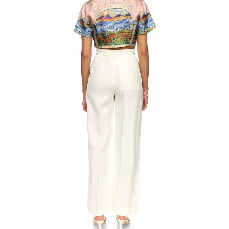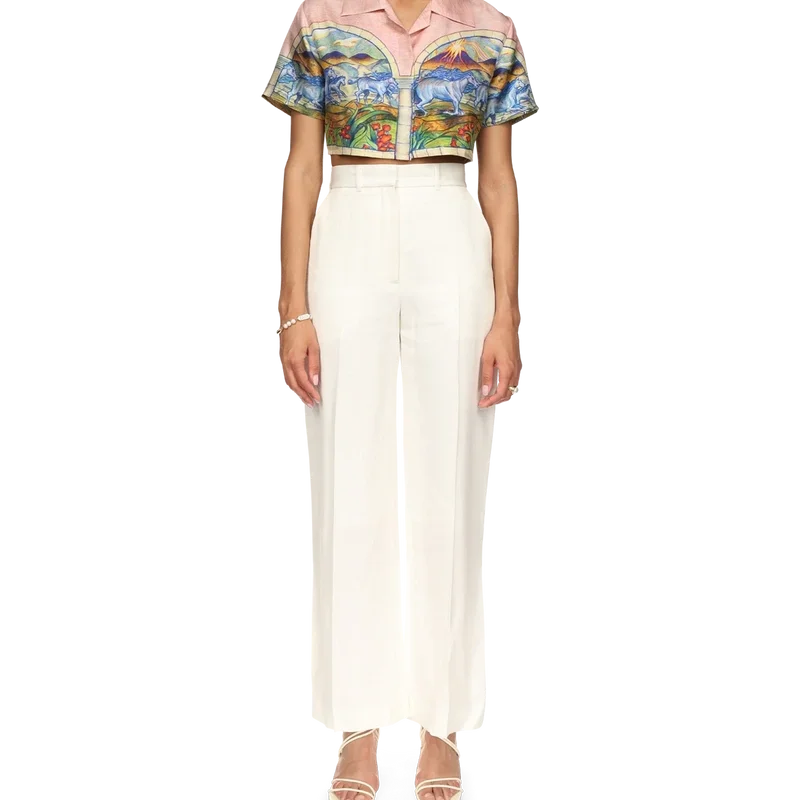 La camisa corta de seda Chevaux Sauvages presenta un estampado de temporada de la colección Futuro Optimisto. Acabada con cuello abierto y cierre de botones, pensada para llevarse abierta.