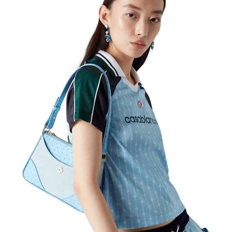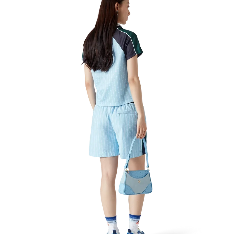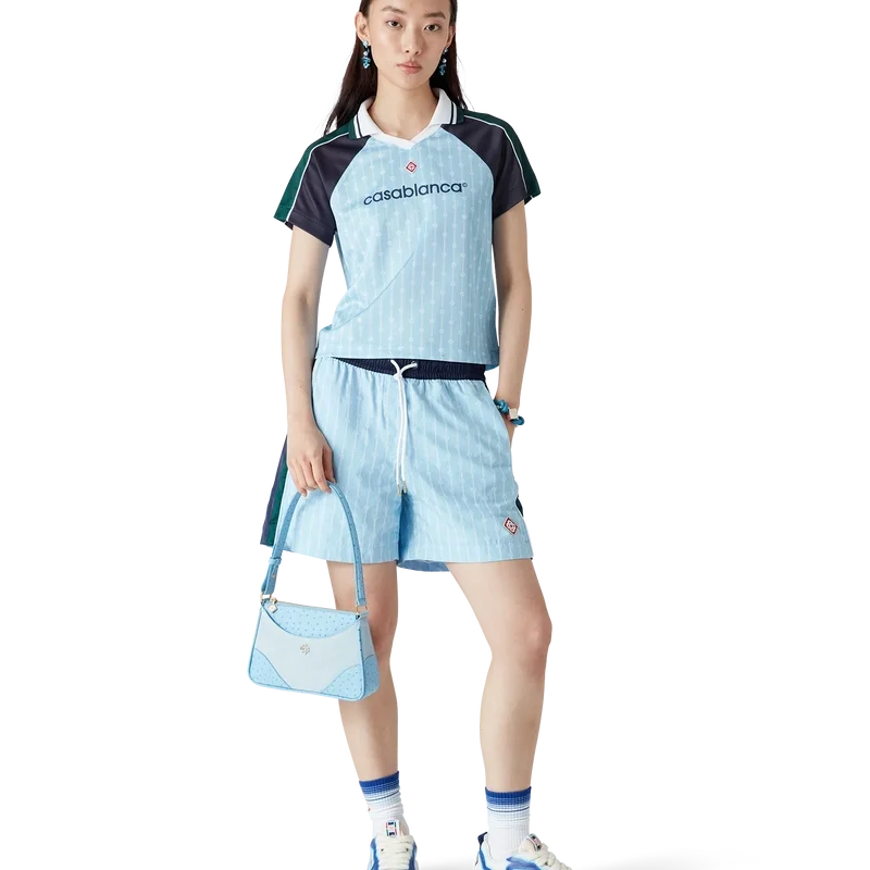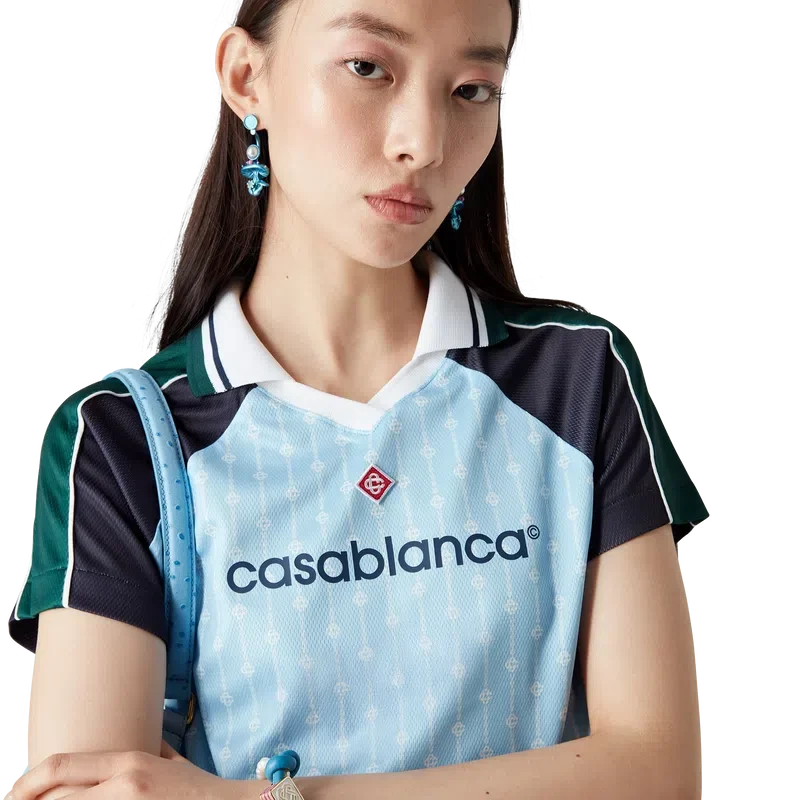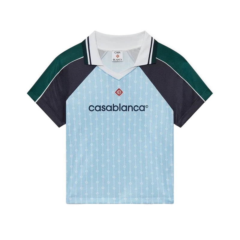 La camiseta de fútbol Laurel con rayas finas es una prenda deportiva de manga corta confeccionada en tejido de malla Birdseye y decorada con el emblemático logotipo entrelazado «CC» de la marca. Se completa con paneles negros y verdes en los hombros y las mangas, el emblemático logotipo de diamante, el logotipo de Casablanca, ribetes blancos, cuello en V acanalado y cuello con detalle de bordes a rayas en negro, blanco y verde.