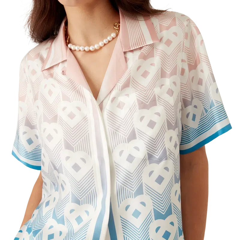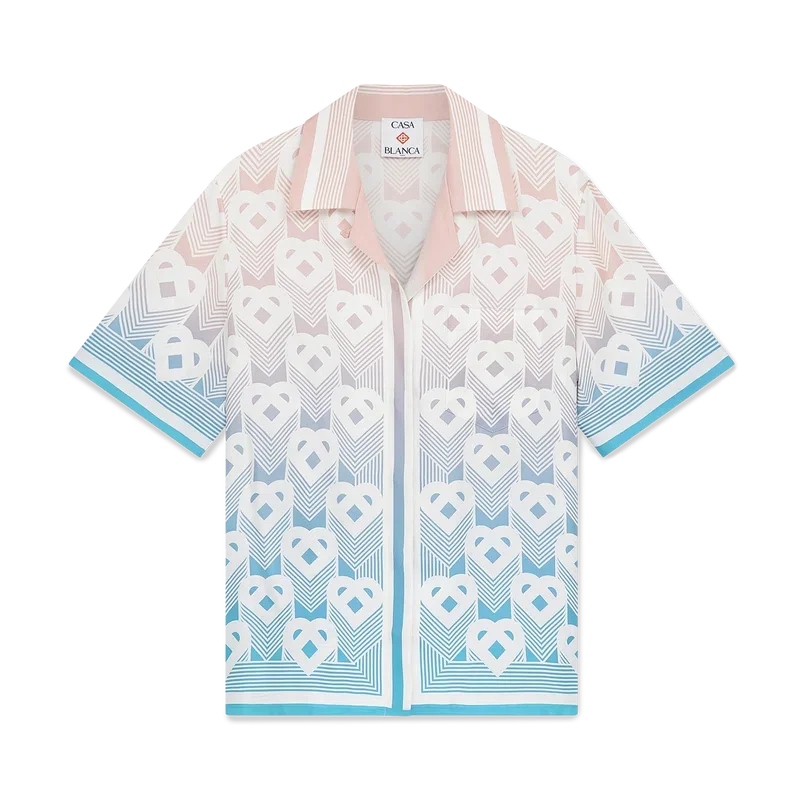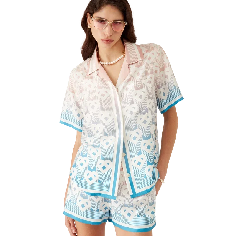 La camisa de pantalón corto de seda con monograma de corazones degradados presenta un diseño estampado en toda la prenda con el monograma de corazones de la casa sobre un fondo degradado en rosa y azul. Confeccionada en sarga de seda Monogram y rematada con cuello cubano, bolsillo en el pecho y detalles de rayas en el cuello, los puños, el dobladillo y la tapeta.