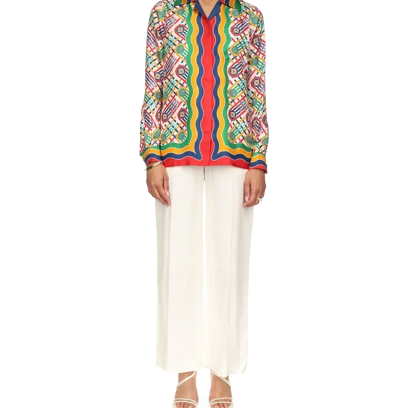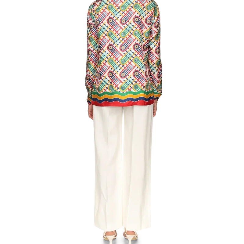 Camisas de seda de manga larga con monograma Tennis para mujer. Presenta el diseño característico de la casa reinterpretado para la cápsula exclusiva de Nordstrom, centrada en la moda deportiva moderna inspirada en el tenis. Acabada con cuello abierto, ribete rojo, cierre frontal con botones y botones de perla con borde dorado característicos, diseñada para un ajuste relajado.