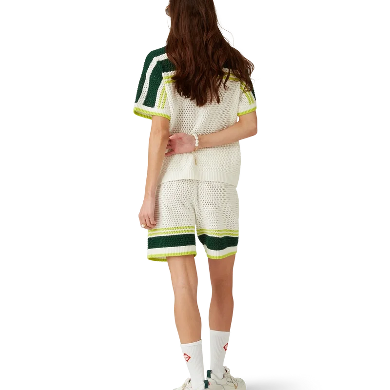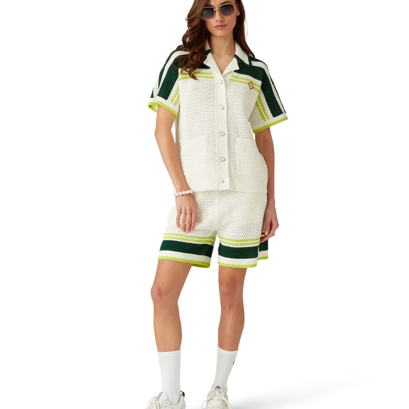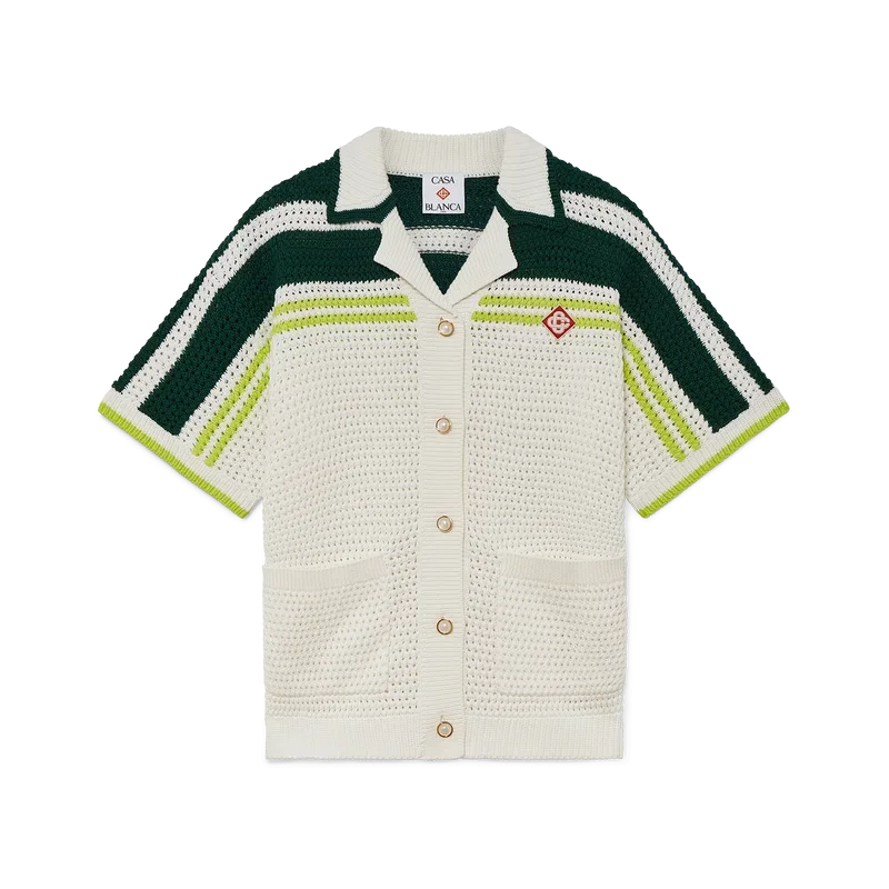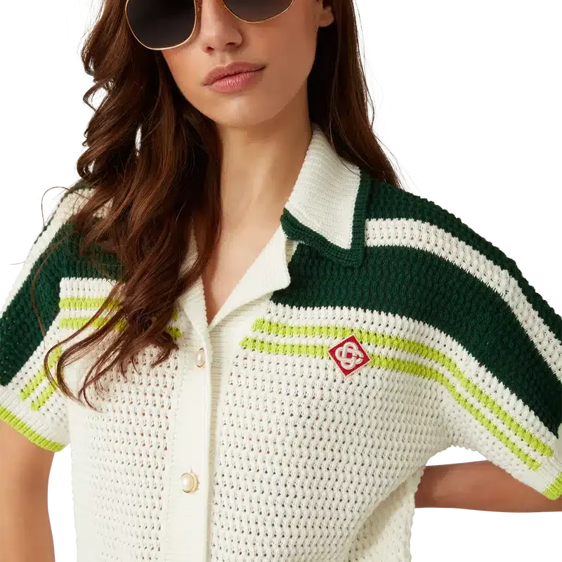 La camisa de tenis de ganchillo es un diseño de punto de manga corta confeccionado en tejido de algodón de ganchillo y presenta el logotipo de diamante característico de la casa. Se completa con botones de perla con borde dorado característicos, detalles de rayas en los hombros y a lo largo de las mangas, bolsillos de parche en la parte delantera y detalles de bordes a rayas en el cuello y los puños.