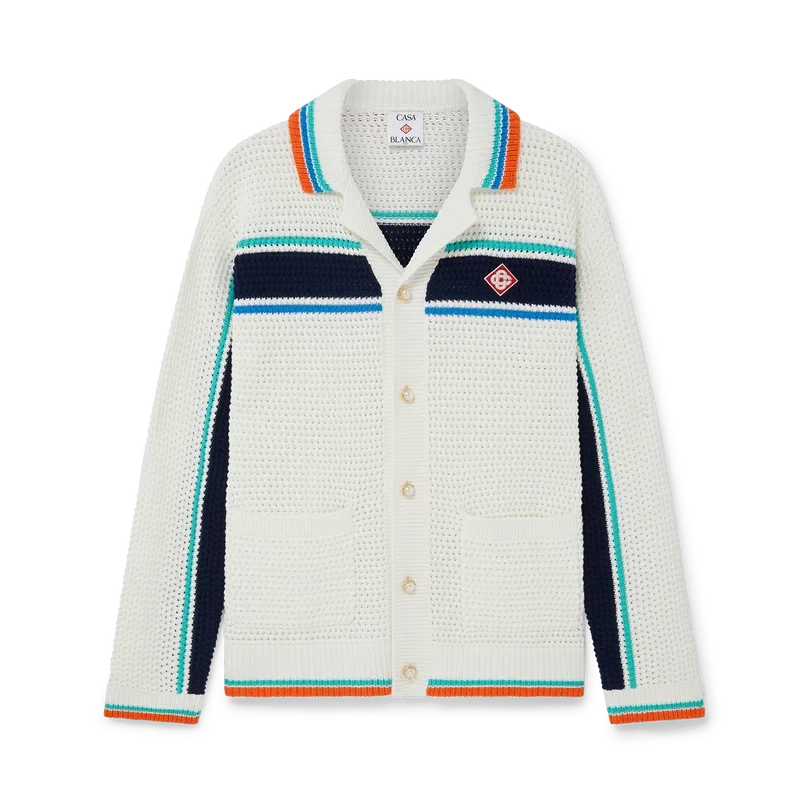 La chaqueta Tennis Crochet Shacket es un diseño texturizado de manga larga confeccionado en tejido de algodón orgánico de ganchillo y presenta el logotipo de diamante característico de la casa, que remite al tema de viajes y vacaciones de la colección cápsula. Se completa con cuello, puños, dobladillo y tapeta acanalados, bolsillos de parche delanteros, botones de perla con borde dorado característicos, cierre frontal con botones y detalles de rayas en azul, blanco y aguamarina en el pecho, la espalda y las mangas, con detalles de bordes en contraste en los puños, el dobladillo y el cuello.