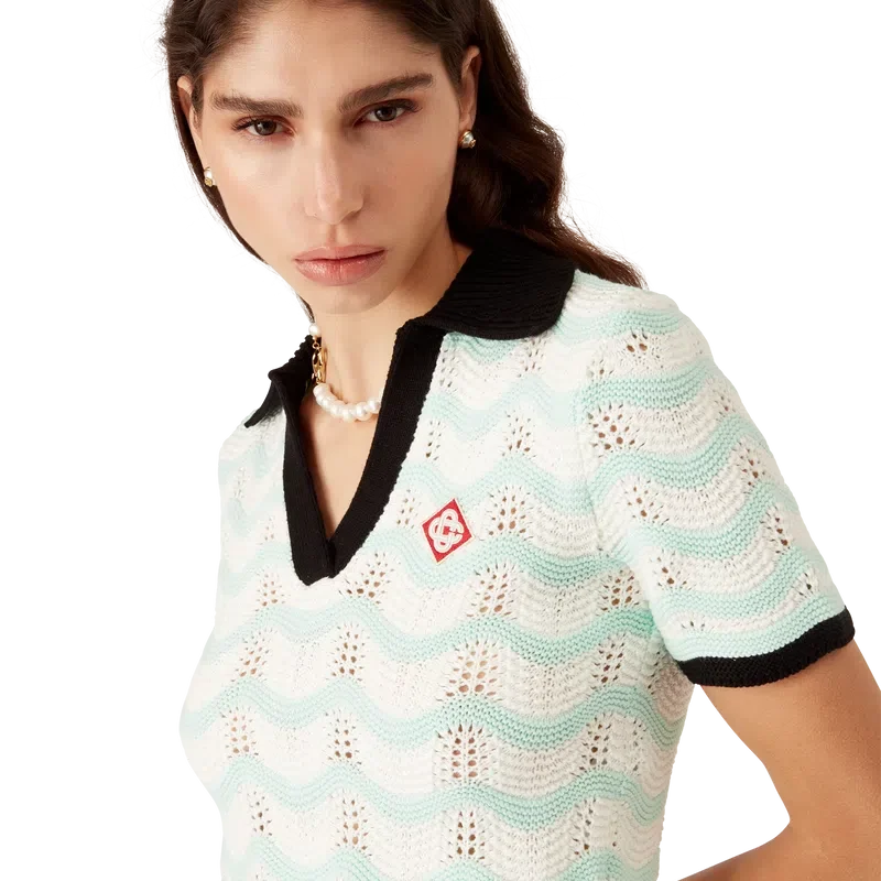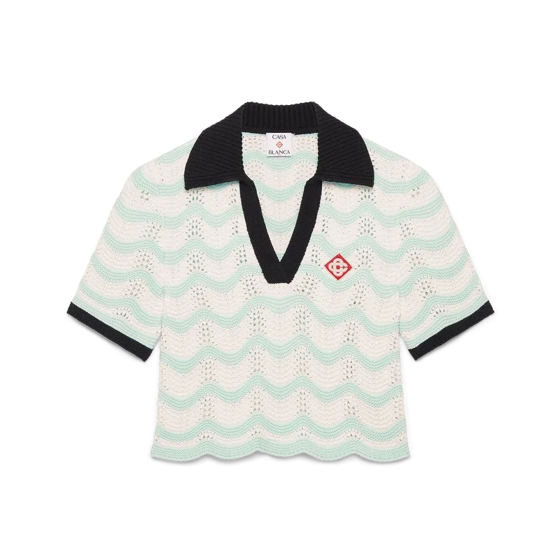 El polo corto de algodón con ganchillo ondulado es un diseño de manga corta que presenta el logotipo de diamante característico de la casa, confeccionado en tejido de algodón de ganchillo. Se completa con cuello en V, cuello, dobladillo inspirado en las olas y tapeta, puños y cuello acanalados en contraste negro; diseñado para quedar por encima del ombligo.