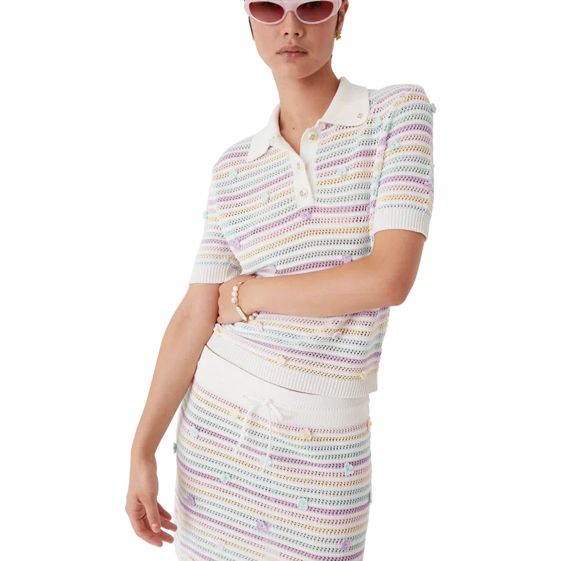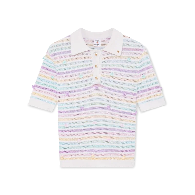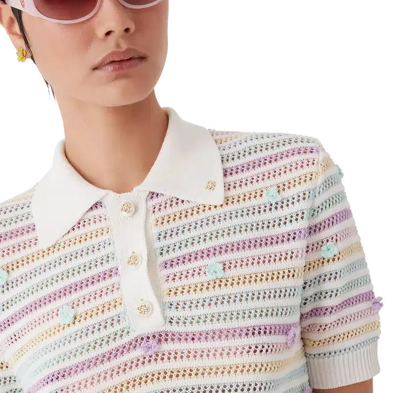 El polo de algodón de ganchillo con rayas florales es un diseño clásico de manga corta confeccionado con un tejido de algodón de trama abierta. Rematado con botones de perla con borde dorado característicos, motivos florales y detalles de cuello, puños, tapeta y dobladillo acanalados.