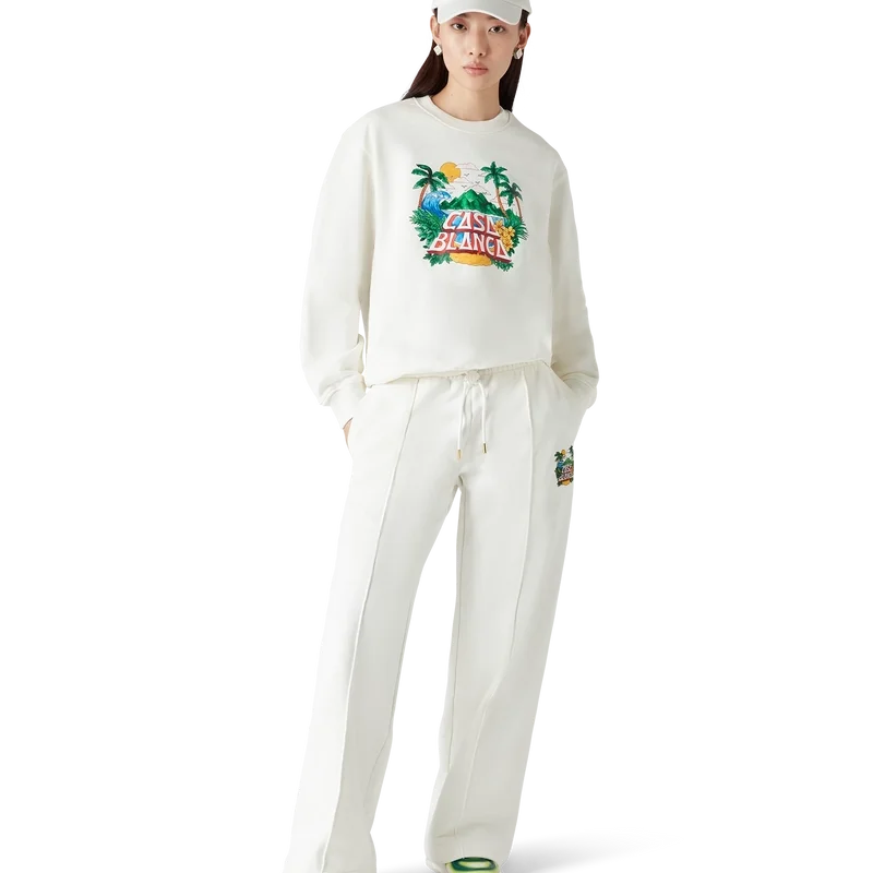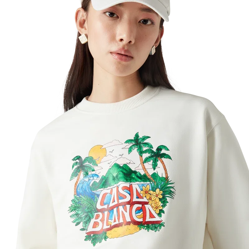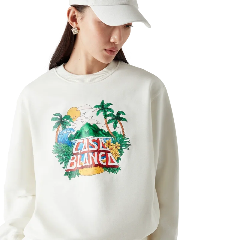 La sudadera Casa Beach Wave es un diseño estampado de manga larga confeccionado en tejido de algodón orgánico y presenta un diseño característico que hace referencia a una camiseta de recuerdo que uno compraría en unas vacaciones en la playa. Cuenta con un cuello redondo clásico.