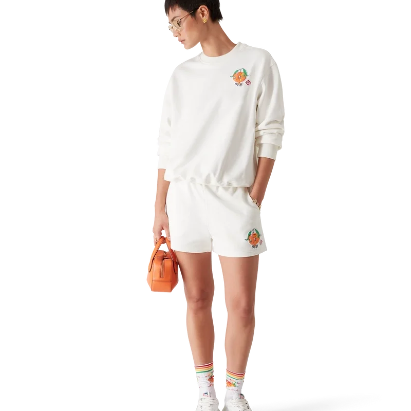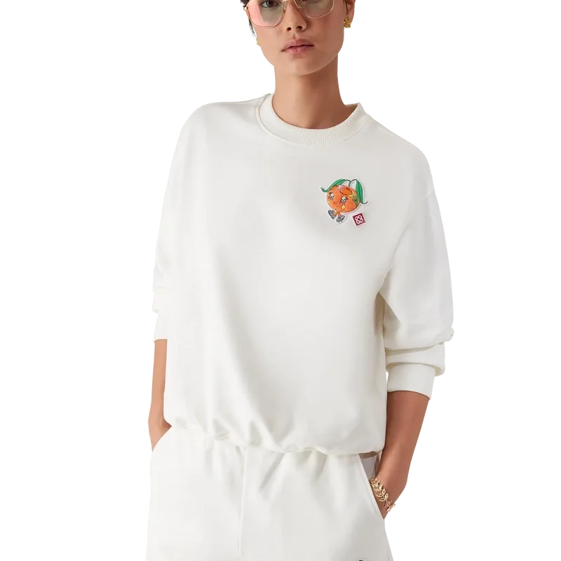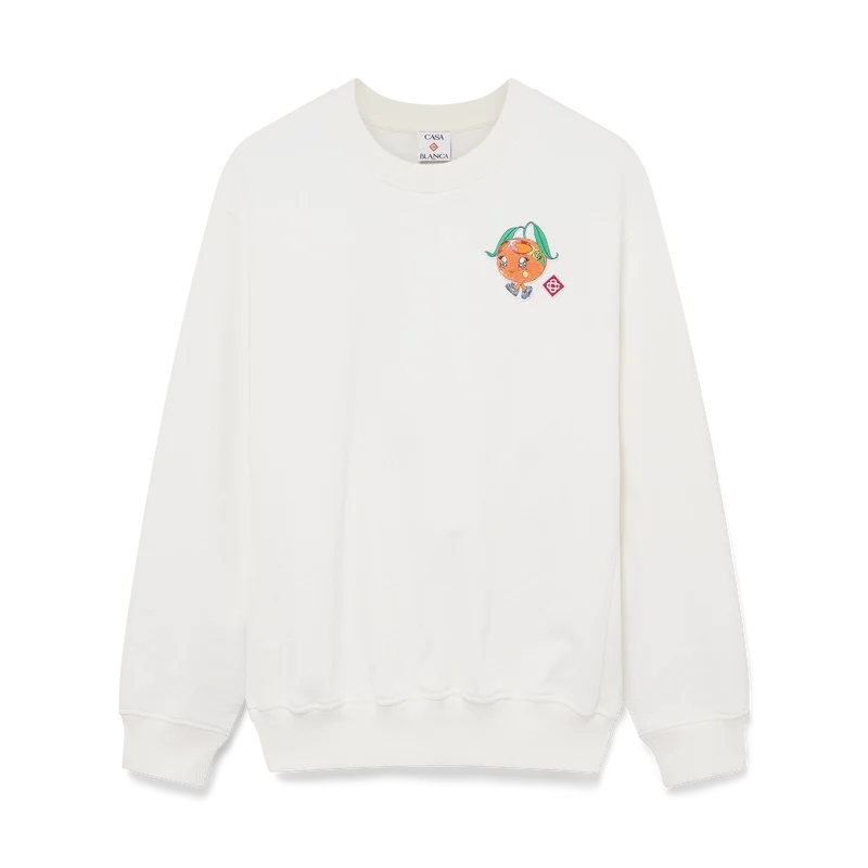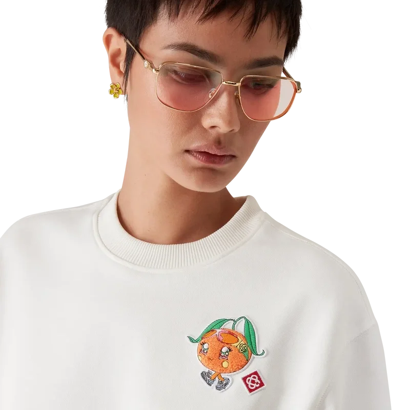 La sudadera Orange Mascot es una prenda de manga larga con un diseño bordado que presenta la ilustración de esta temporada de este personaje, diseñado como una naranja —otra figura clave en nuestro universo—, con accesorios de Casa, gafas y tenis, que aparece principalmente en los looks de ropa de mujer. Se completa con un clásico cuello redondo acanalado, puños y dobladillo.