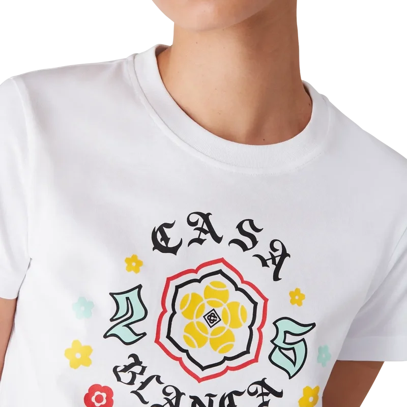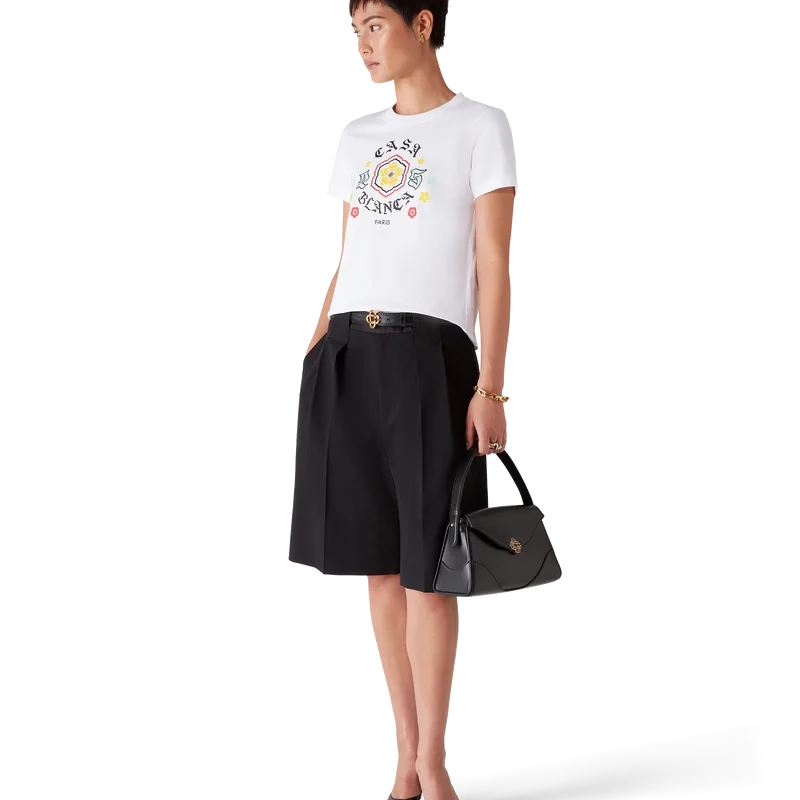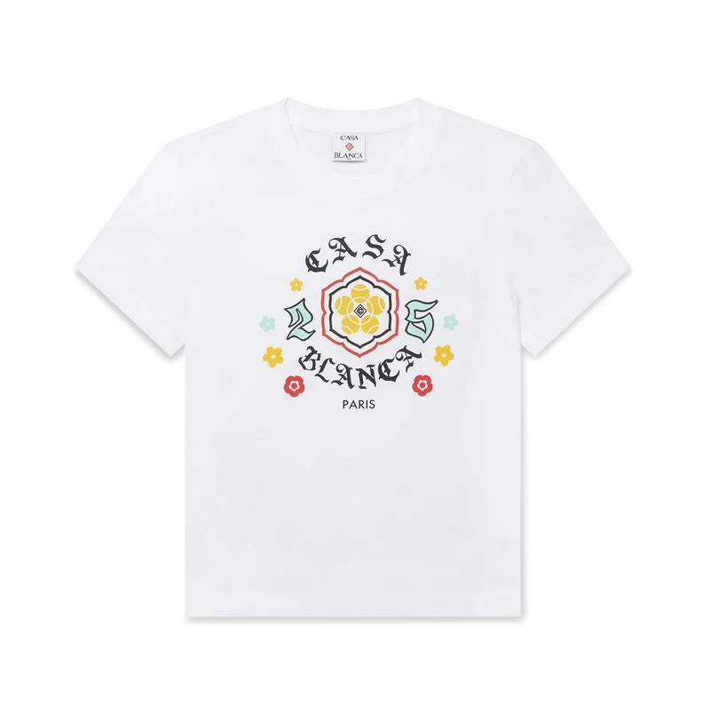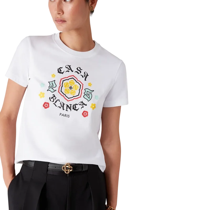 La camiseta ajustada con emblema es un diseño de manga corta que presenta el arte de esta temporada, en el que nos inspiramos en la subcultura japonesa del BōSōZoku para uno de nuestros temas principales. El contraste entre los elementos gráficos y el texto nos recordó mucho a Casablanca. Creamos nuestra propia versión del arte BōSōZoku, incorporando frases que describen la marca, como «Contemplando la belleza del mundo». El diseño es poco convencional, pero la composición está cuidadosamente equilibrada, lo que le da un aire único y a la vez armonioso. Se completa con un clásico cuello redondo.