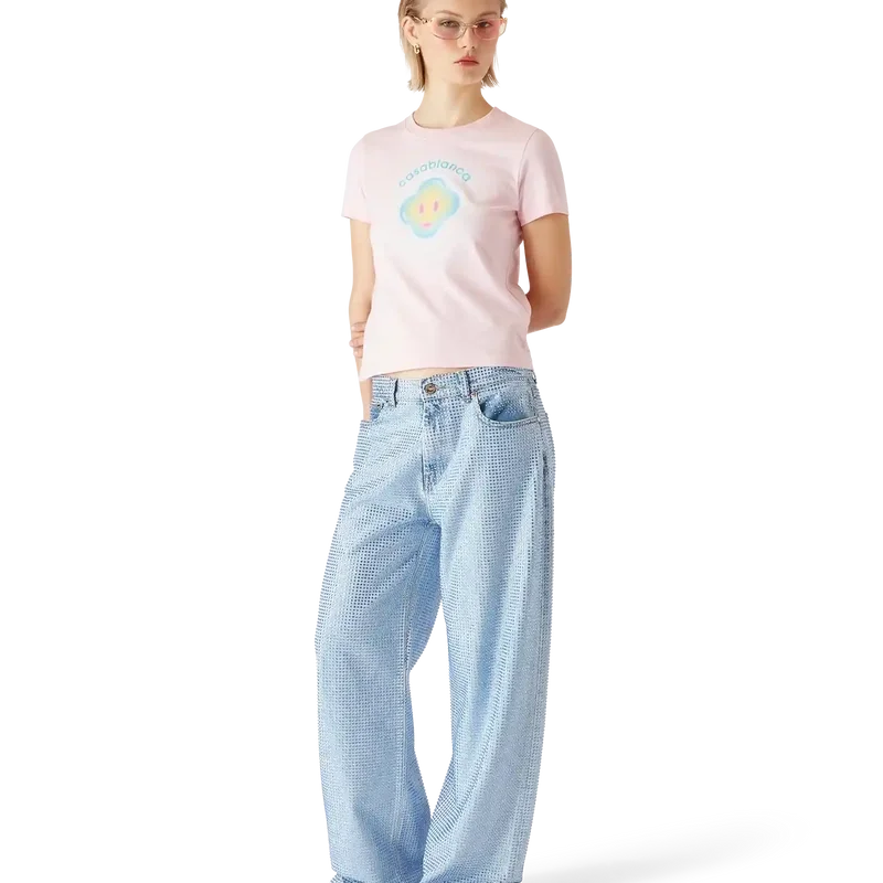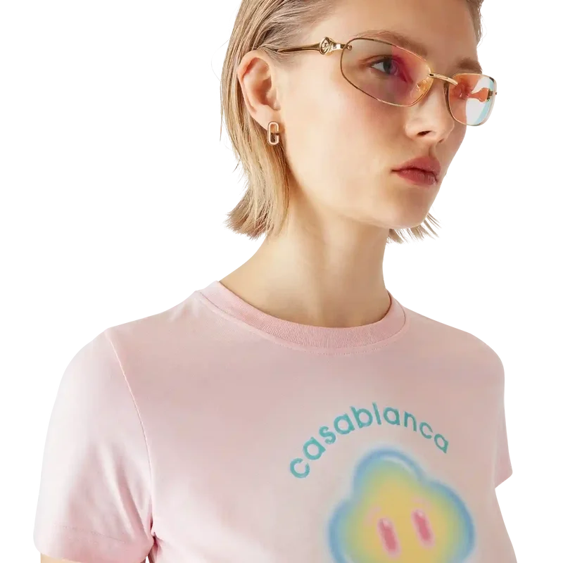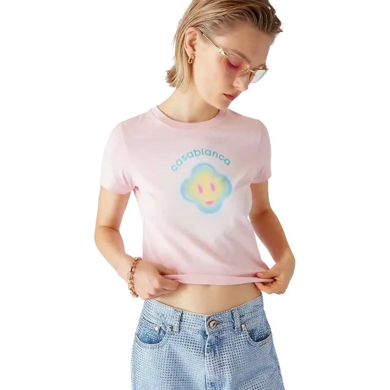 La camiseta ajustada de pantalones cortos con smiley pintado con aerógrafo se inspira en la evolución de la cara sonriente dentro de la escena de la música house. Partiendo de exploraciones previas con la técnica del aerógrafo, el diseño se inspira en su presencia icónica en los volantes y las primeras portadas de música house. Se completa con un clásico cuello redondo acanalado.