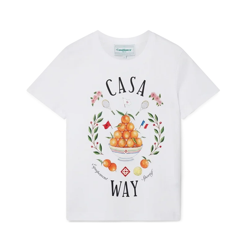 La camiseta Casa Way presenta un estampado de la obra de arte emblemática de la casa, reinterpretada para esta temporada incorporando elementos del tenis. Confeccionada en algodón 100 % orgánico y rematada con un clásico cuello redondo y la etiqueta de la marca Casablanca.