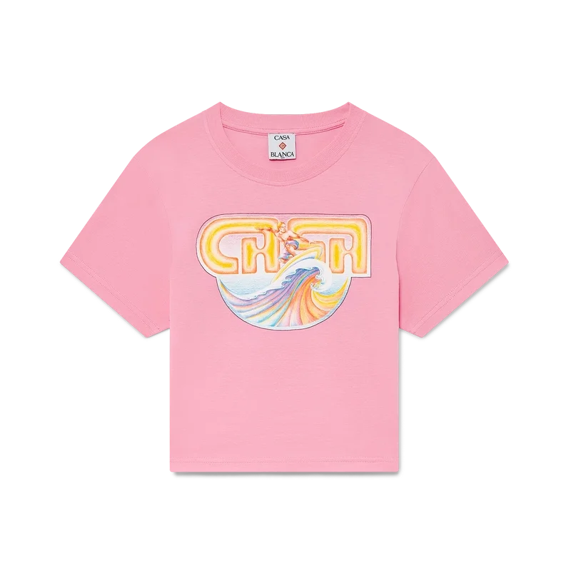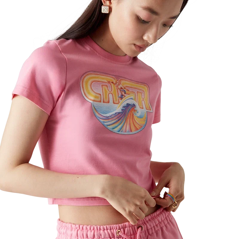 La camiseta corta Casa Surf es un diseño estampado de manga corta confeccionado en tejido de algodón Pima y presenta un diseño exclusivo inspirado en las tablas de surf vintage descoloridas por el sol de los años 70. Se completa con un cuello redondo clásico. Diseñada para quedar por encima del ombligo.
