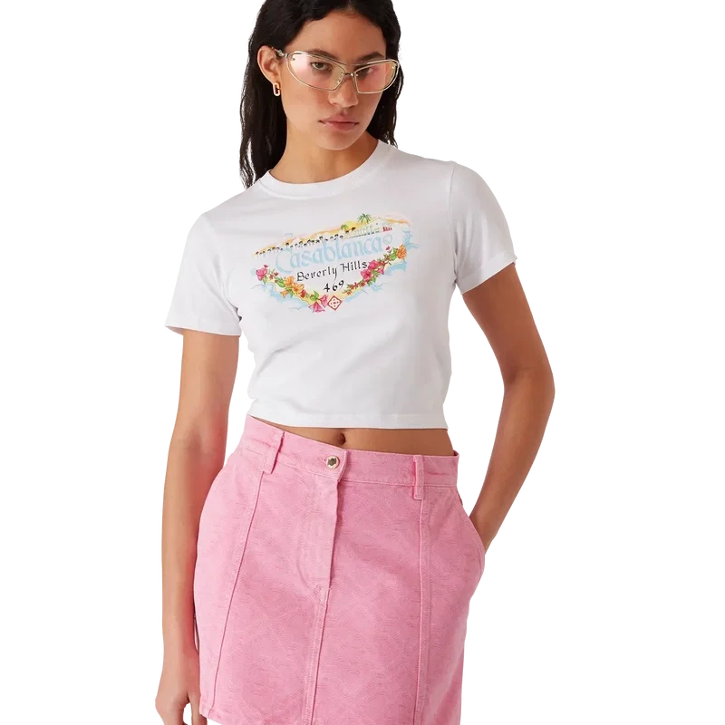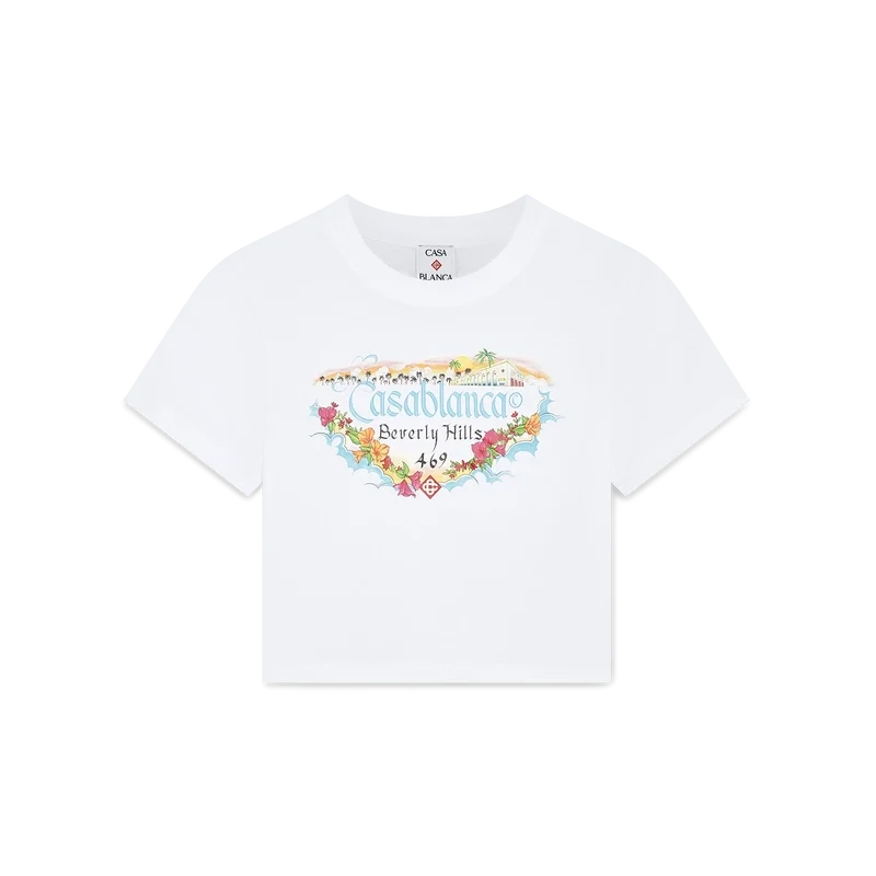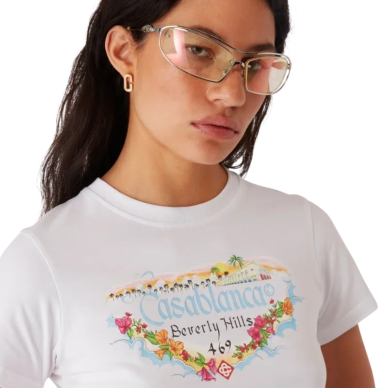 La camiseta corta «Los Angeles Store» es un diseño de manga corta inspirado en la primera tienda de Casablanca en EE. UU., situada en la esquina de Santa Monica Boulevard y North Canon Drive, en Beverly Hills. La tienda, la segunda de la marca en el mundo, rinde homenaje a Los Ángeles, una ciudad que ha sido durante mucho tiempo una fuente de inspiración para el fundador y director creativo Charaf Tajer. Con gráficos vibrantes y multicolores, el diseño celebra las influencias culturales de Los Ángeles, mezclando códigos urbanos con referencias a la cultura y la arquitectura mexico-estadounidenses. Se completa con un clásico cuello redondo.<!–