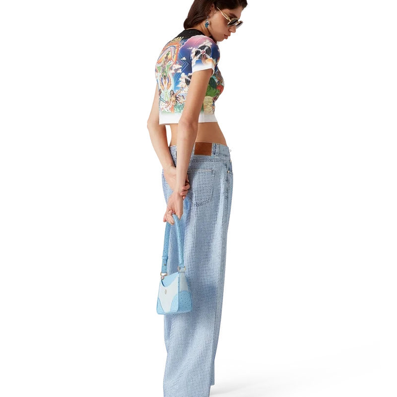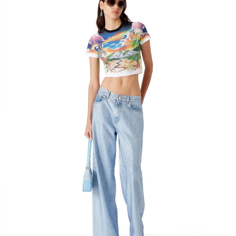 La camiseta corta La Musique es un diseño de manga corta confeccionado con un tejido de algodón estampado que presenta el diseño de la temporada, una oda a Bootsy Collins y a los icónicos discos de funk de los años 70. Se completa con un cuello redondo acanalado en contraste. Diseñada para quedar por encima del ombligo.