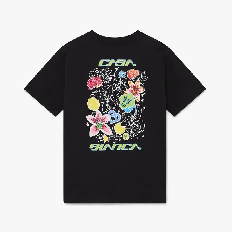 La camiseta de manga corta Black Graffiti presenta un diseño refinado con el motivo de grafitis de la temporada, que representa la iconografía y los elementos de diseño de la nueva temporada, incluyendo interpretaciones del logotipo, la cara sonriente y la flor de orquídea. Se completa con un cuello redondo y una silueta holgada.
