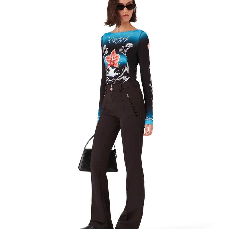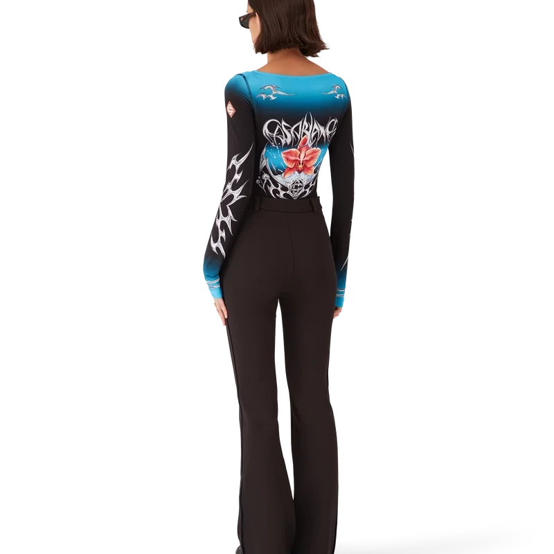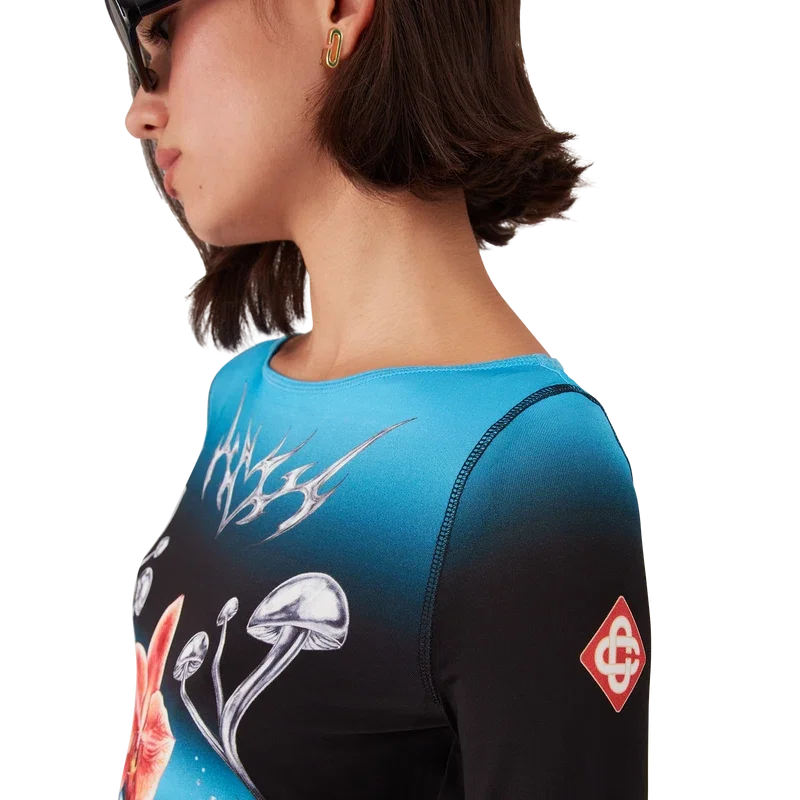 La camiseta de manga larga Blades presenta un diseño estampado con el arte de Blades de esta temporada, que juega con el contraste entre dos sensaciones opuestas: la nitidez de la hoja y el frío cromo plateado, en contraste con la calidez de la naturaleza, como los tonos rosa y rojo intensos de una flor de orquídea. La incorporación de gotas de agua aporta un elemento fresco y nítido al diseño. Se completa con cuello barco, detalles de puños a rayas y el logotipo del diamante característico de la casa en las mangas.