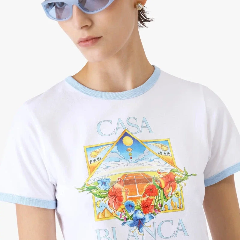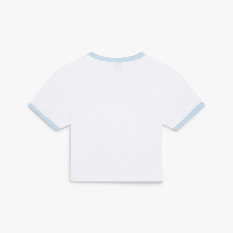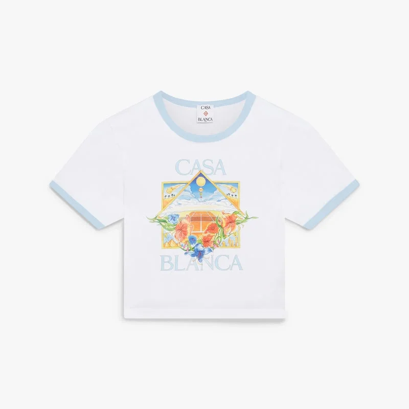 La camiseta de pantalón corto para bebé Tennis Landscape Ringer tiene un diseño corto y presenta el diseño artístico Tennis Landscape de la temporada, en el que marcos interconectados crean nichos de diferentes escenas que describen la trascendencia del tiempo y el lugar a través del enfoque del deporte. Se completa con un cuello redondo, detalles de ribete acanalado en contraste y una silueta ajustada.