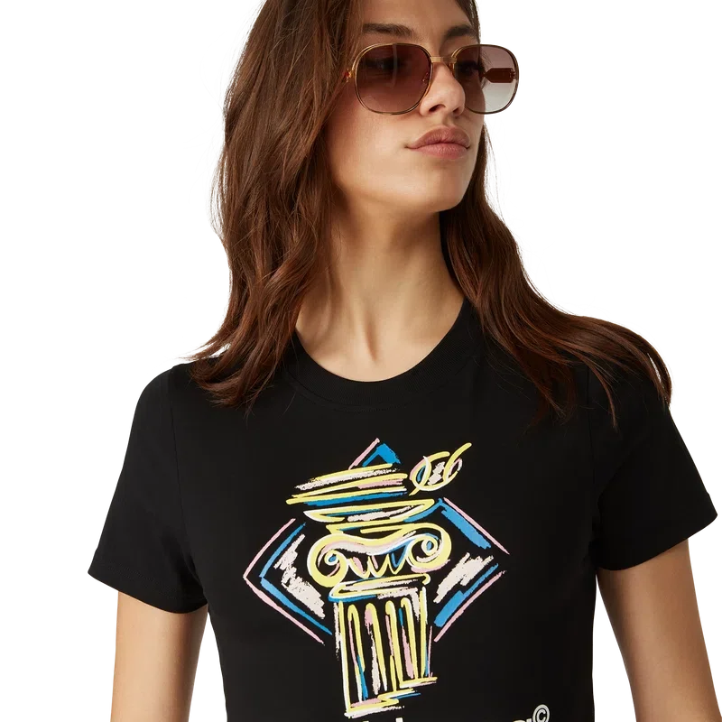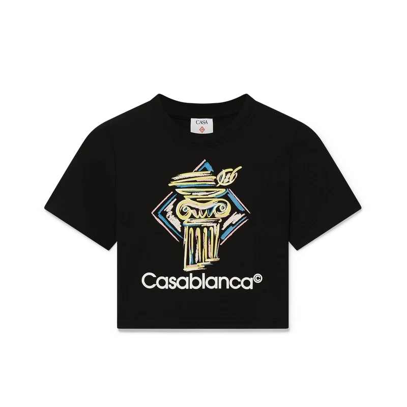 La camiseta Diamond Column Baby es un diseño estampado de pantalón corto y corte corto confeccionado en tejido de mezcla de algodón con la iconografía de la casa: una columna dibujada a lápiz. Se completa con un cuello redondo clásico, diseñada para quedar por encima del ombligo.