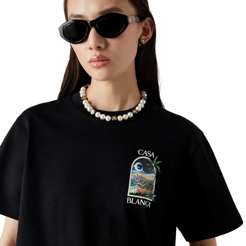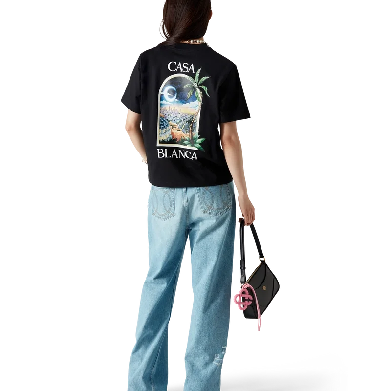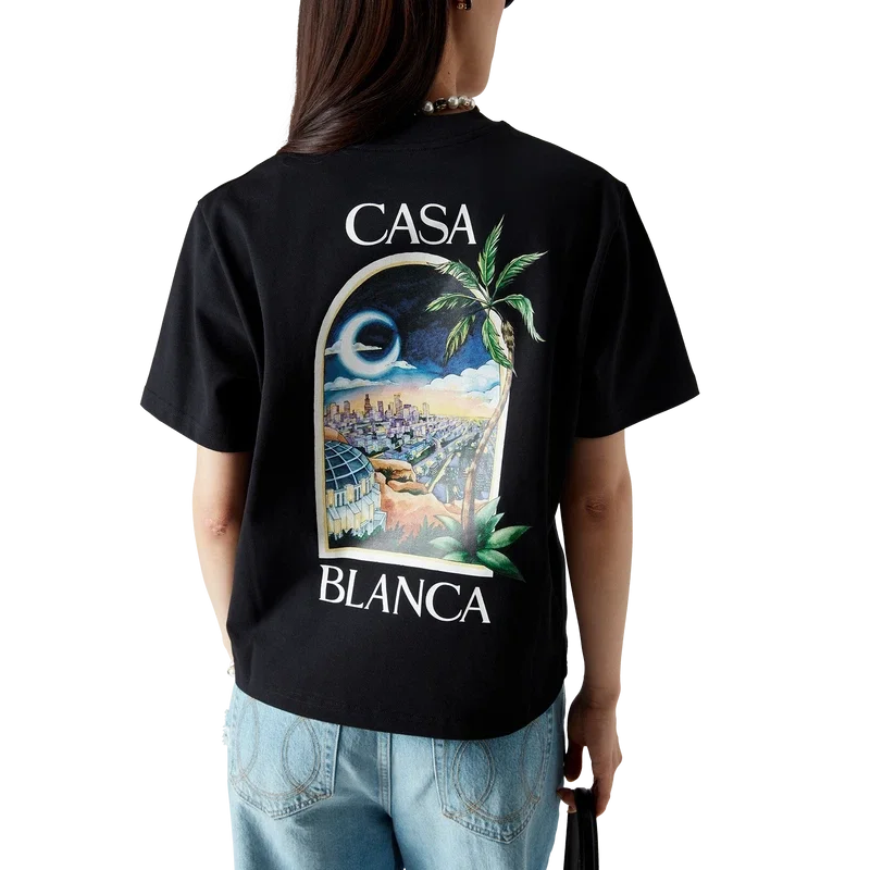 La camiseta La Nights es un diseño estampado de manga corta confeccionado en tela de algodón orgánico y presenta un diseño exclusivo que representa una ventana a un paisaje nocturno de Los Ángeles. Se completa con un cuello redondo clásico.