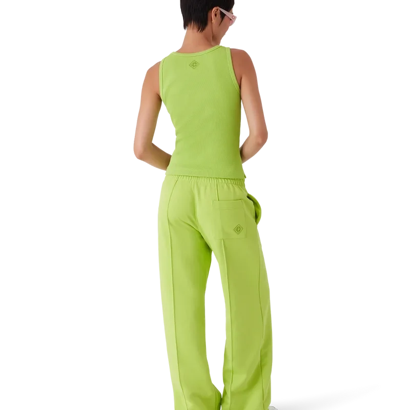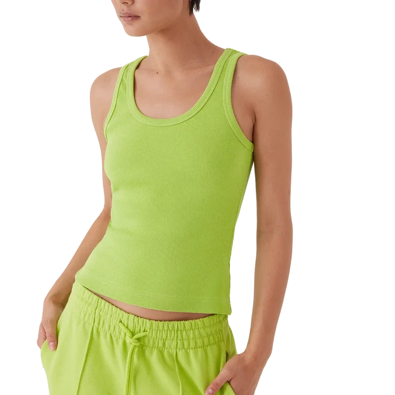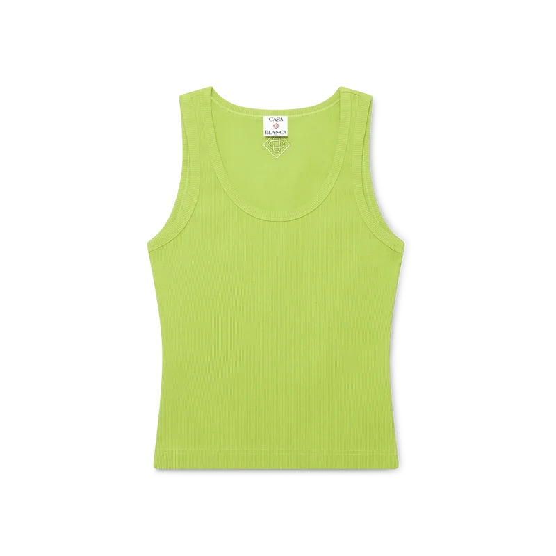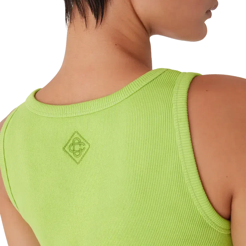 La camiseta sin mangas acanalada es un modelo ajustado y de pantalones cortos, confeccionado en tejido de jersey acanalado. Se completa con un parche metálico con el logotipo, un cuello redondo y detalles en blanco con un patrón ondulado en contraste alrededor del cuello y las sisas.