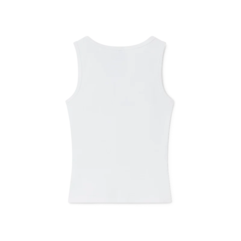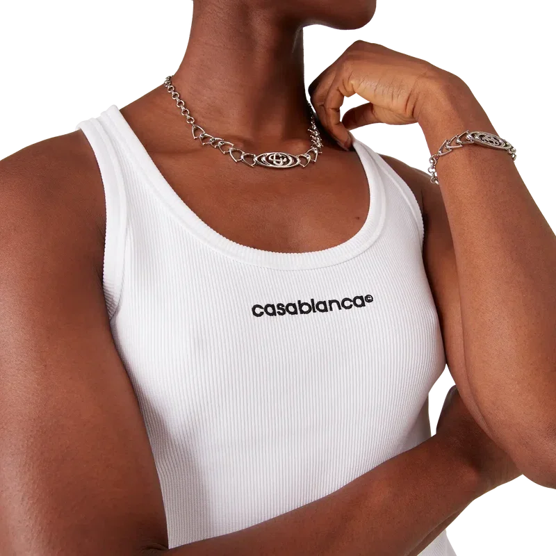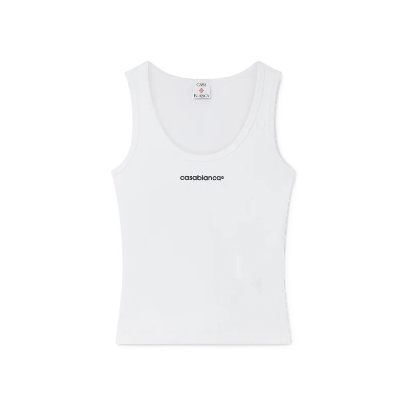 La camiseta sin mangas acanalada es un diseño sin mangas con una construcción acanalada texturizada, que refleja los códigos discretos del estilo deportivo-casual. Se completa con el logotipo de Casablanca, un cuello redondo y detalles acanalados alrededor del cuello y las sisas.