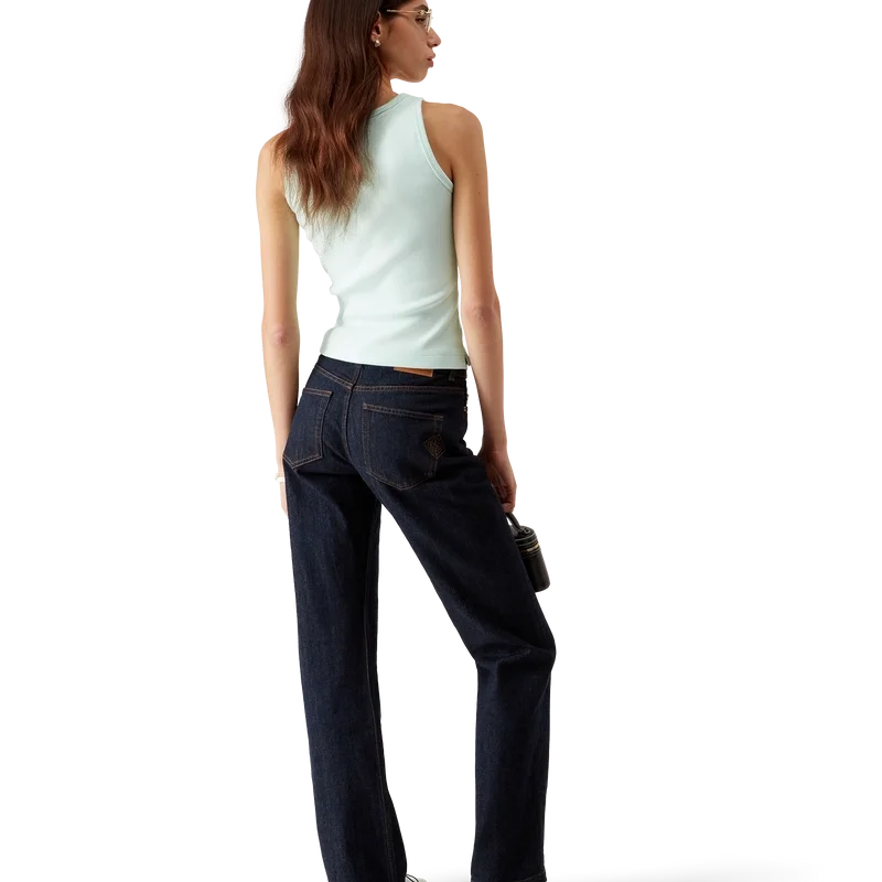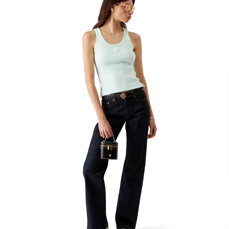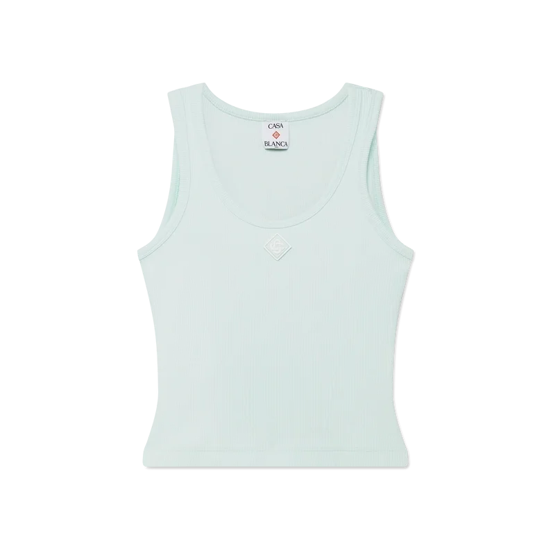 La camiseta sin mangas de jersey acanalado es un modelo ajustado y de pantalones cortos, confeccionado en tejido de jersey acanalado. Se completa con un parche del logotipo CC entrelazado de silicona, cuello redondo y detalles de bordes con patrón de ondas en contraste blanco alrededor del cuello y las sisas.