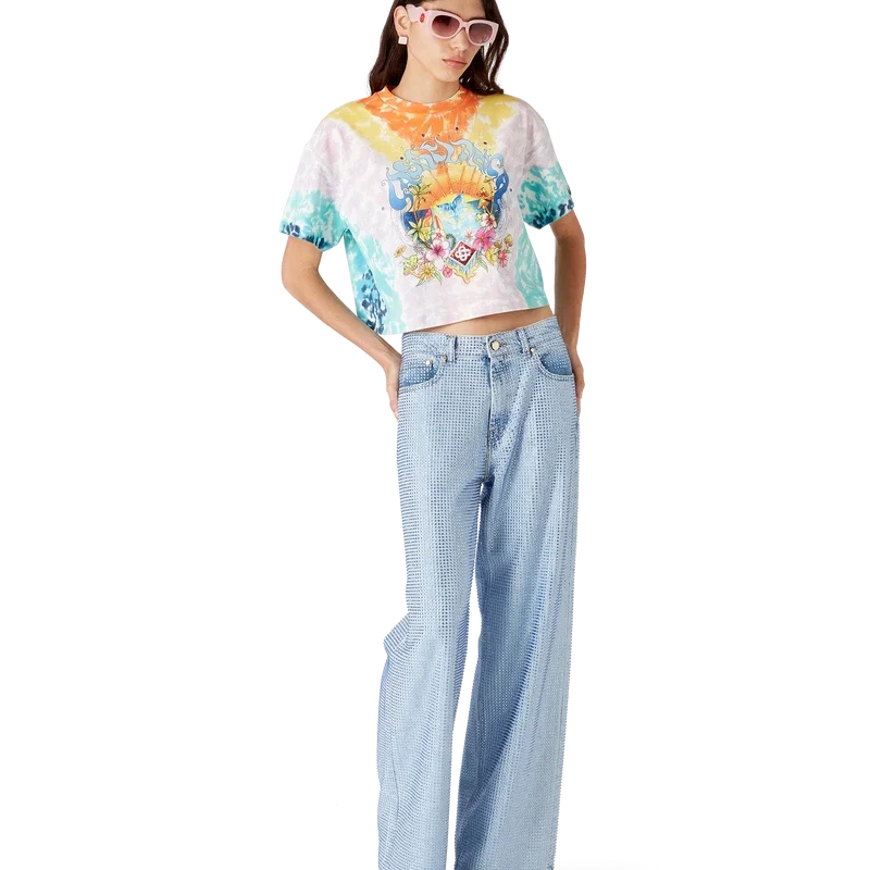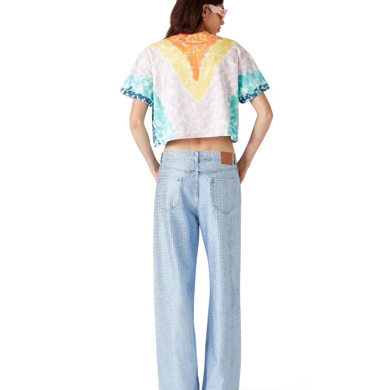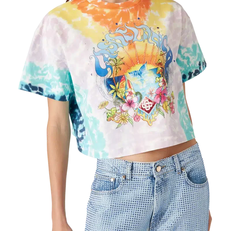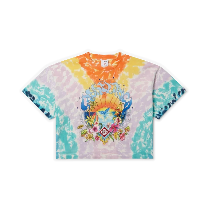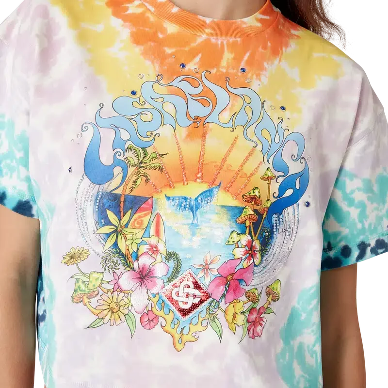 La camiseta Surf Trip Tie Dye es un diseño estampado de manga corta confeccionado en tejido de algodón orgánico y presenta un diseño de temporada inspirado en la cultura surfera vintage de Malibú, utilizando tipografía de esa época sobre un fondo tie-dye que hace referencia a la cultura hippie. Se completa con un clásico cuello redondo acanalado. Diseñada para quedar por encima del ombligo.