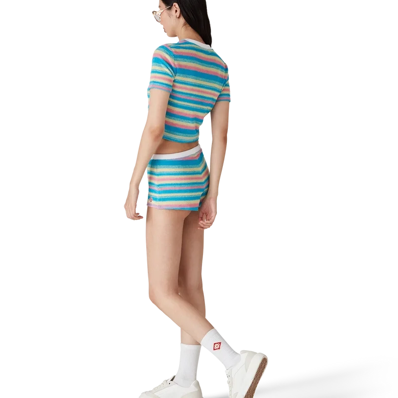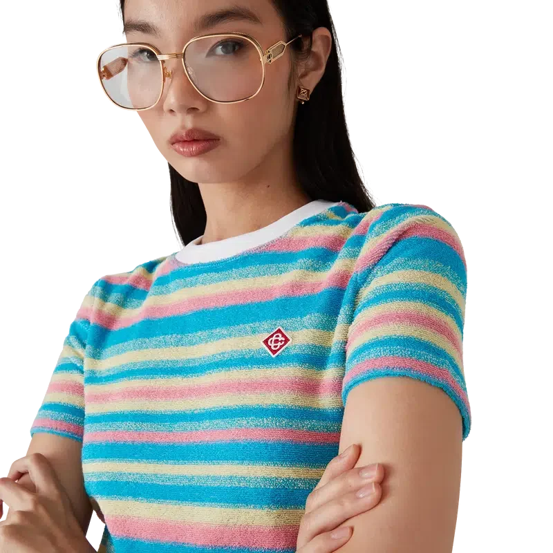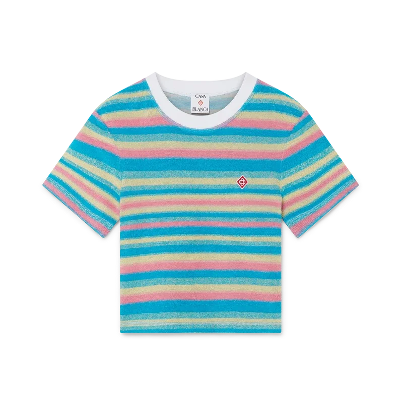 La camiseta de rizo a rayas es un diseño de manga corta confeccionado en tejido de rizo y presenta el logotipo del diamante característico de la casa. Se completa con un clásico cuello redondo.