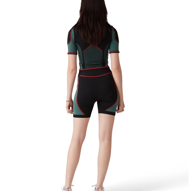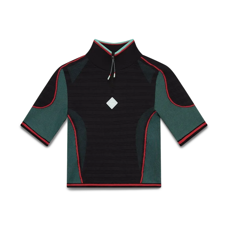 La camisa sin costuras con media cremallera es un diseño de manga corta inspirado en la ropa deportiva, confeccionado con un tejido elástico acanalado sin costuras. Cuenta con cierre de cremallera, cuello polo y presenta el logotipo de diamante de la casa y detalles de paneles.