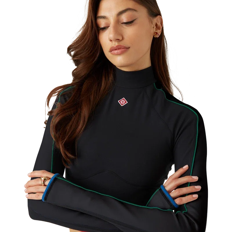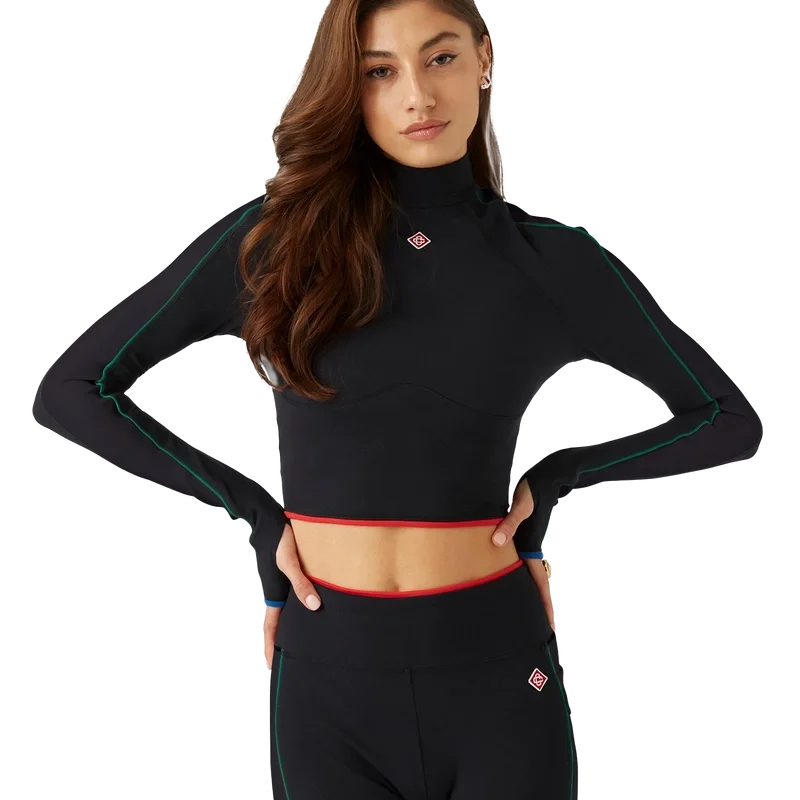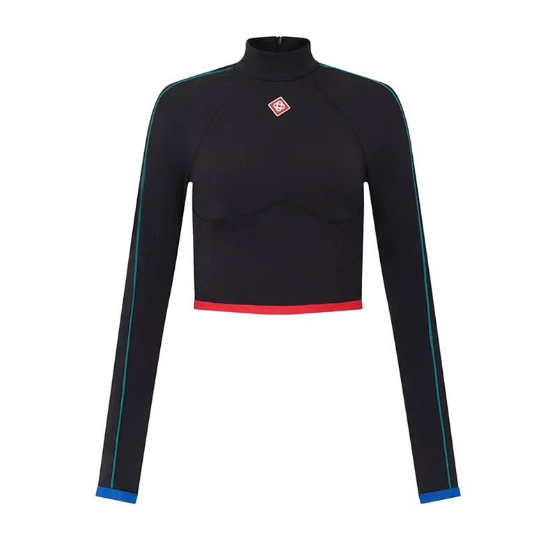 La camiseta deportiva es un diseño de ropa deportiva de manga larga confeccionado con tejido elástico. Se completa con el Diamond Monogram característico de la casa, cuello de polo, detalle de rayas blancas desde los hombros hasta las muñecas y detalle de contraste en el dobladillo.