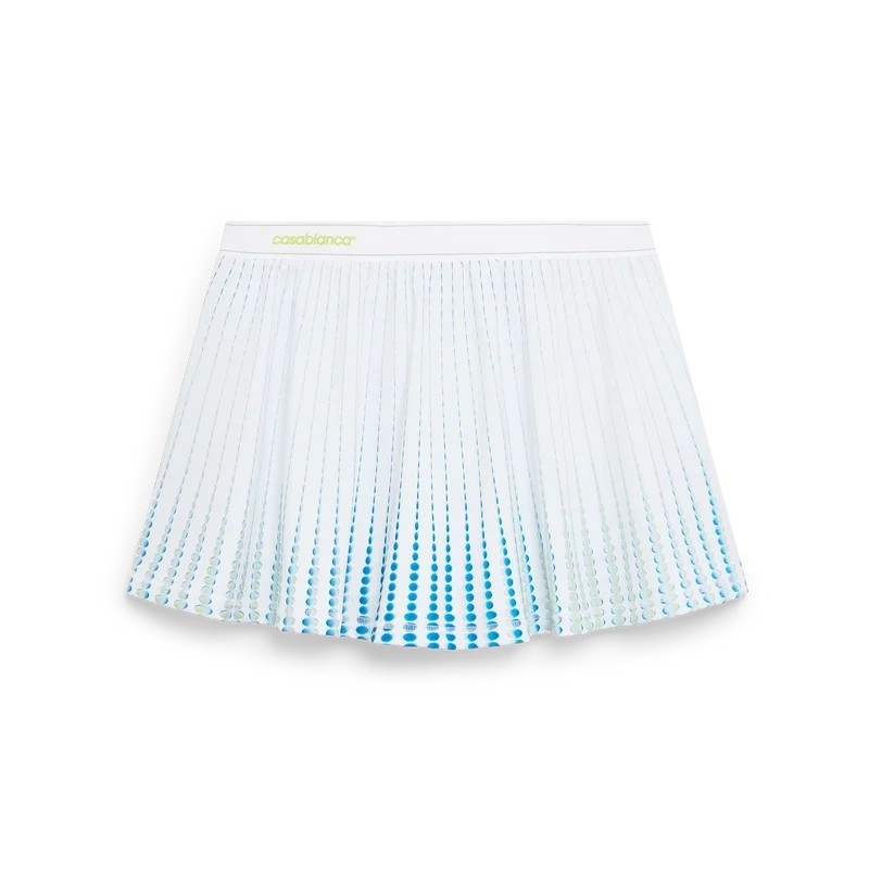 La falda Racer con estampado de tenis y jacquard articulado tiene un diseño en línea A con ilustraciones creadas en colaboración con Martin Naumann, conocido por su trabajo con degradados y efectos de textura. Se completa con una cintura elástica con el logotipo de Casablanca y detalles de rayas.