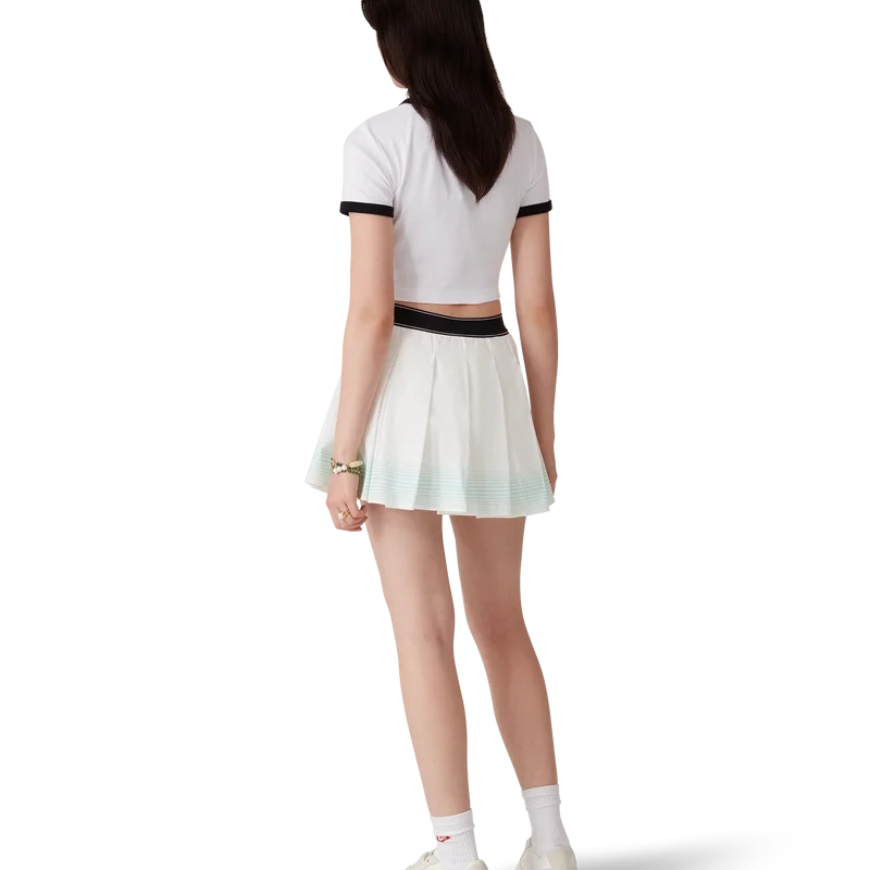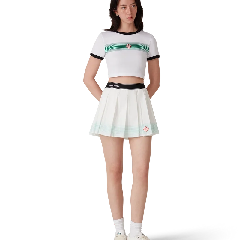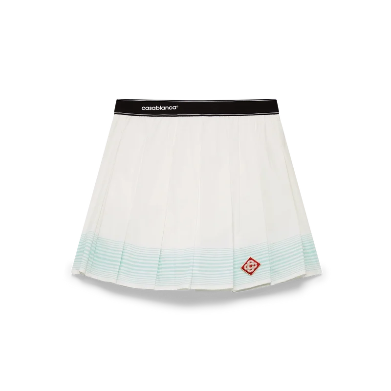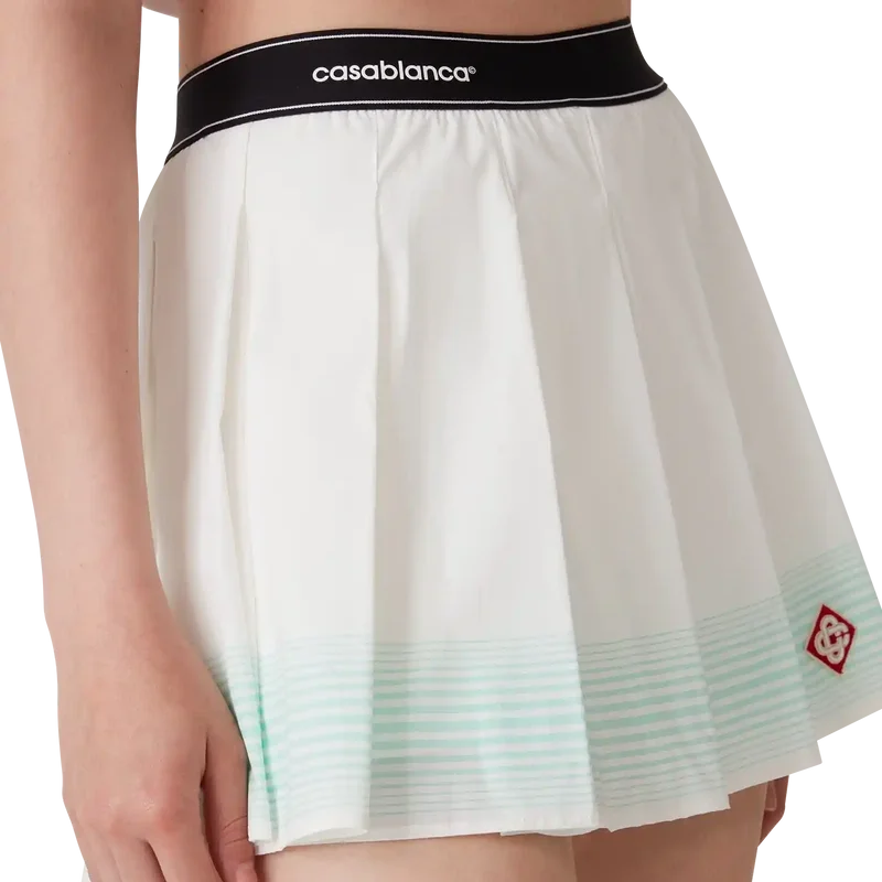 La minifalda plisada a rayas es un modelo corto que luce el logotipo de diamante característico de la casa. Se completa con una cintura elástica en contraste con el logotipo de Casablanca estampado en cuadros, un detalle de rayas horizontales en degradado verde en el dobladillo y unos pantalones cortos ajustados integrados.