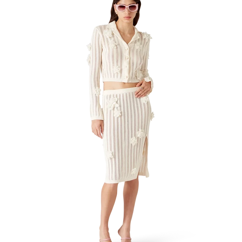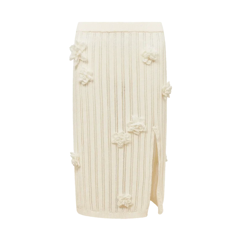 La falda de punto con encaje floral es un diseño a la altura de la rodilla confeccionado con tejido de algodón de punto con encaje. Cuenta con una cintura elástica acanalada, una abertura y apliques con motivos florales.
